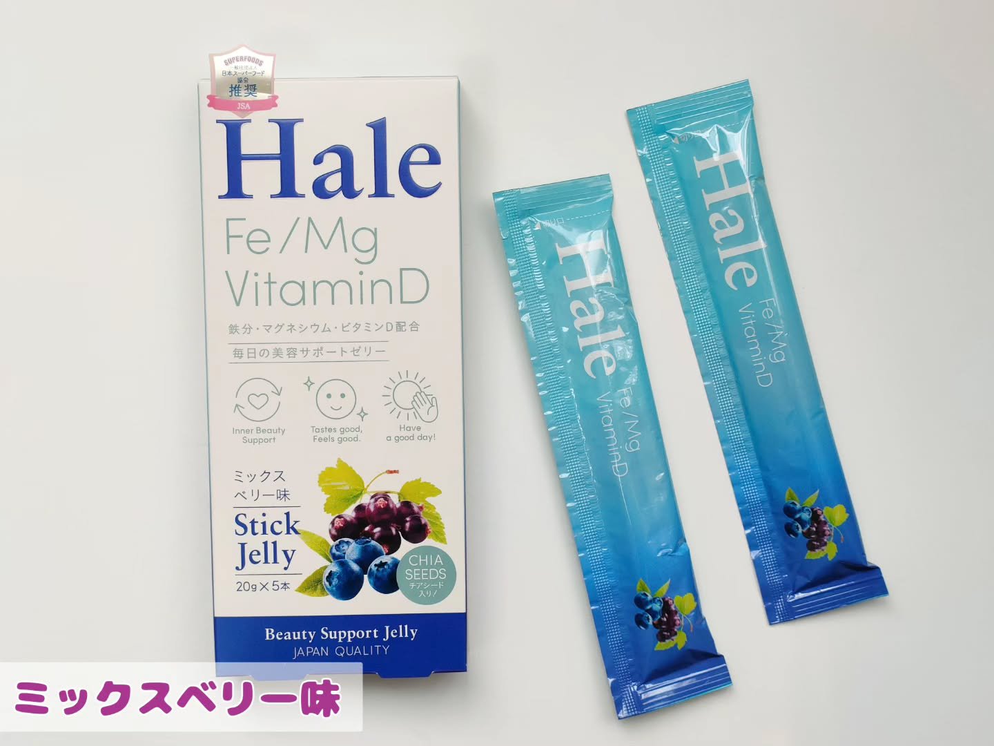 - 「Hale ざくろ味」には、今注目のモノグルコシルヘスぺリジン、GABA、ビタミンB6と美容をサポートする成分を配合し、「Hale ミックスベリー味」には、女性に不足しがちな鉄分、マグネシウム、ビタミンDを配合しています。2品ともに新開発の食べ応えのあるゼリー食感とチアシードのつぶつぶ感を楽しめる美容サポートゼリーです。5本タイプと手軽な1本タイプがあり、外で小腹が空いた時など、カバンに持ち運べるサイズでいつでも楽しむことができます。