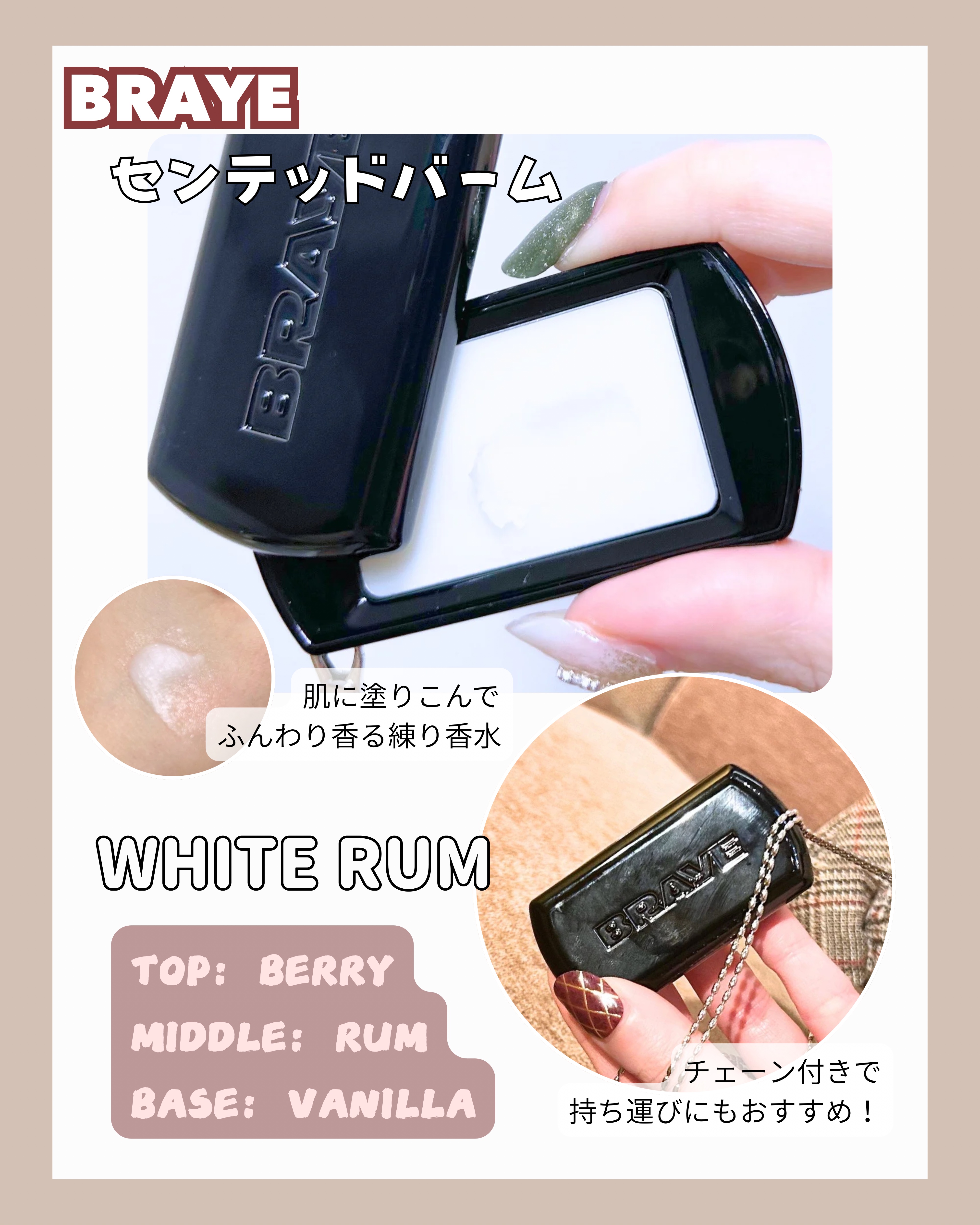 - センティッドバームは、クールで洗練された女性のスタイルを完成させるラストタッチとして誕生した「ソリッドパフューム」です。 アクティブな日々をエレガントに楽しむ女性から、静かで落ち着いた日常を慈しむ女性まで、BRAYEだけが持つ独特なムードをどこでも手軽に、そして魅力的にお楽しみいただけます。 ●ホワイトラム 穏やかな夜、ホワイトラームを片手に思索にふける品格のある女性の優雅で官能的な香り 甘くも冷ややかなベリー系の香りで始まり、ドライローズのローズ、バニラの風味を儚い香りと、 じっくりと熟成されたラムの深みが調和し、落ち着いた夜、静かなバーでホワイトラムを傾けながら思索にふける上品な女性を訪仏させます。 ●ブルージーンズ ブルージーンズのクールで爽やかな雰囲気と、瑞々しいシトラスが放つ その日に安らぎと解放感を込めた、心地よい香り。 瑞々しいタンジェリンの香りに新鮮なトマトリーフが加わり、誘き通る青空の下でブルージーンズを身に纏い、 自由な気持ちで街を歩くような心の安らぎがすっきりとした香りと共に広がります。