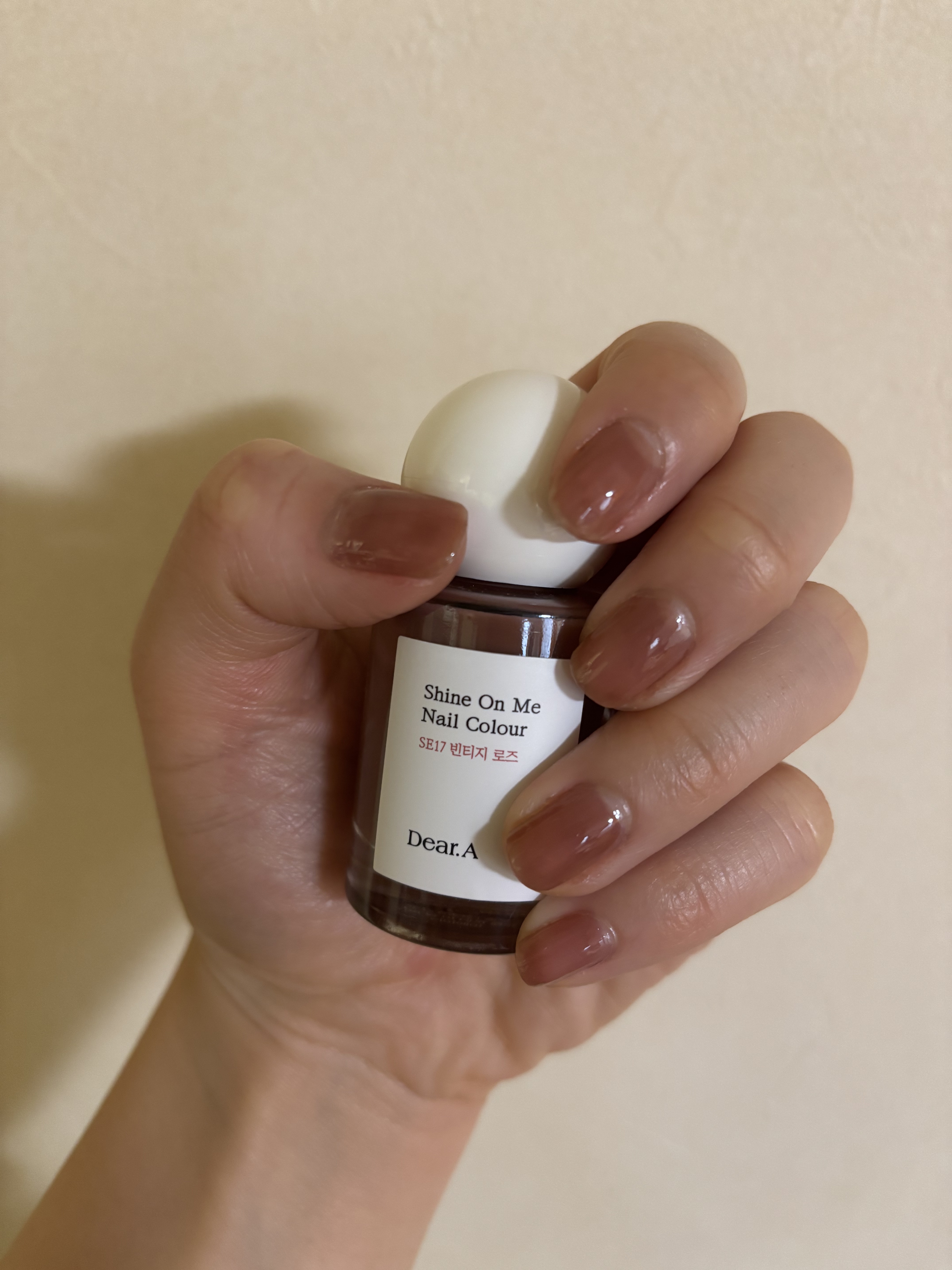 Dear.A/シャインオンミーネイルカラーSE17.ヴィンテージローズ可愛いけどネイル下手な私には1度塗りでは薄く、2度塗りはややムラが出来る。薄めで仕上げるか、ベースカラーして塗るか。もちろんベースカラーをどうするかで雰囲気は変わる。写真は...