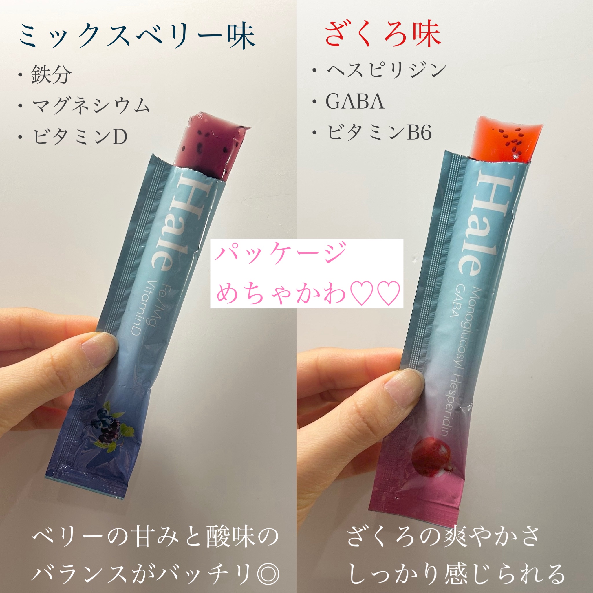 - 「Hale ざくろ味」には、今注目のモノグルコシルヘスぺリジン、GABA、ビタミンB6と美容をサポートする成分を配合し、「Hale ミックスベリー味」には、女性に不足しがちな鉄分、マグネシウム、ビタミンDを配合しています。2品ともに新開発の食べ応えのあるゼリー食感とチアシードのつぶつぶ感を楽しめる美容サポートゼリーです。5本タイプと手軽な1本タイプがあり、外で小腹が空いた時など、カバンに持ち運べるサイズでいつでも楽しむことができます。