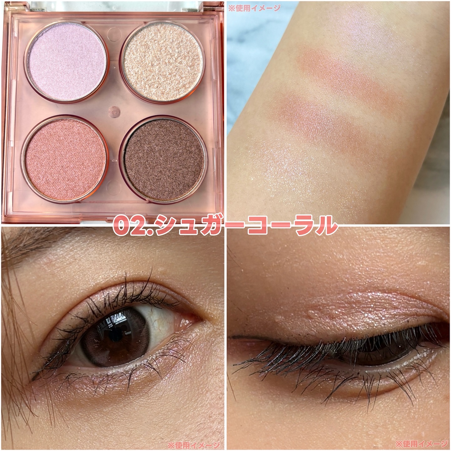 - <01 エンジェリックモーブ> 合成フルオロフロゴパイト、タルク、酸化チタン、フェニルトリメチコン、ホウケイ酸(Ca/Al)、リンゴ酸ジイソステアリル、シリカ、ホウケイ酸(Ca/チタン)、マイカ、ステアリン酸亜鉛、水添ポリイソブテン、ダイマージリノール酸ダイマージリノレイルビス(ベヘニル/イソステアリル/フィトステリル)、ジメチコン、酸化鉄、グンジョウ、1,2-ヘキサンジオール、イソノナン酸イソノニル、ジ安息香酸PG、トリエトキシカプリリルシラン、エチルヘキシルグリセリン、ジメチコンクロスポリマー、酸化スズ、水酸化Al、ミリスチン酸Al、赤226 <02 シュガーコーラル> タルク、合成フルオロフロゴパイト、酸化チタン、ホウケイ酸(Ca/Al)、フェニルトリメチコン、ホウケイ酸(Ca/チタン)、リンゴ酸ジイソステアリル、マイカ、シリカ、ステアリン酸亜鉛、水添ポリイソブテン、ダイマージリノール酸ダイマージリノレイルビス(ベヘニル/イソステアリル/フィトステリル)、ジメチコン、酸化鉄、1,2-ヘキサンジオール、イソノナン酸イソノニル、ジ安息香酸PG、トリエトキシカプリリルシラン、エチルヘキシルグリセリン、ジメチコンクロスポリマー、酸化スズ、水酸化Al、ミリスチン酸Al、赤226、グンジョウ