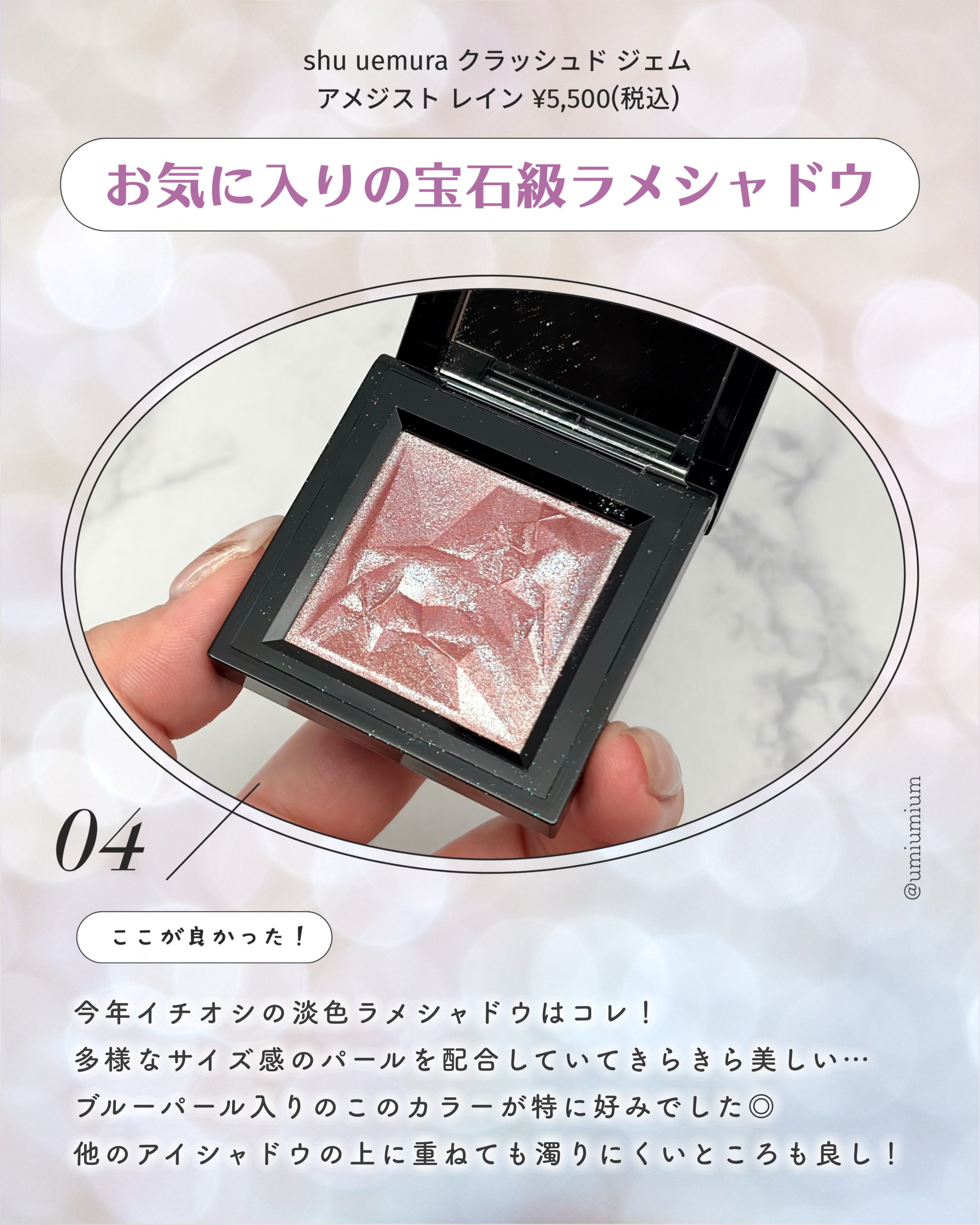 | 単色アイシャドウランキング第3位 | 高密度の多色ラメとクリアパープルが繊細に輝いて、目もとが一気に華やぐ印象でした💎 | 詳細を見る | |