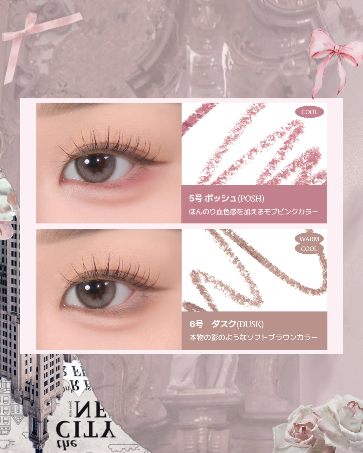 - これ一本で目尻のメイクが簡単綺麗に仕上がる! クリーミーな描き心地&長時間キープ、自然な「三角ゾーン」メイクが簡単に決まる、目元にもなじんで自然に目の幅が広がったようにみせるカラー。ぼかした後はピタッと密着して崩れにくいロングラスティング処方でメイク直しの手間も軽減。 スマージングアンダーライナーは、”拡張メイク”の最大のポイントである三角ゾーンをメイクしやすいよう、ペンシルのスリムな設計と、自然に馴染む“粘膜カラー”にこだわっております。 ペンシルはライナーとシャドウの間のようなテクスチャーでするすると書きやすく、きりっとした印象を演出してくれる猫目メイクアップから、ふんわりと柔らかな印象を与えるナチュラルなタレ目メイクアップまで、幅広いメイクアップをお楽しみいただけます。 また、ラインをぼかし、自然なメイクアップをかなえてくれるブレンドブラシと2in1になっており、1本でこだわりのアイメイクが完成。にじみにくく長期間維持続します。 片方はするすると書きやすいスリムなペンシル、もう片方は自然にぼかしてくれるブラシとなっており、1本で三角ゾーンや粘膜メイクを自然に仕上げてくれる。 また、三角ゾーンを埋めやすいように、スリムにすることで、使いやすい設計に。 #2 ファジー(Fuzzy) 奥ゆかしいロージーブラウンカラー #4 メロウ(Mellow) 純粋さあふれるソフトローズピーチカラー #5 ポッシュ(Posh) ほんのり血色感を加えるモブピンクカラー #6 ダスク(Dusk) 本物の影のようなソフトブラウンカラー #7 ハミング(HUMMING) 柔らかく広がるソフトピッグカラー #8 バニー(Bunny) ふんわりとしたベビーピンクカラー #10 ライク(Like) さわやかに咲き誇るライラックピンクカラー ・先行販売 4月19日(土):ロフト・プラザ・アットコスメ(一部店舗除く)
