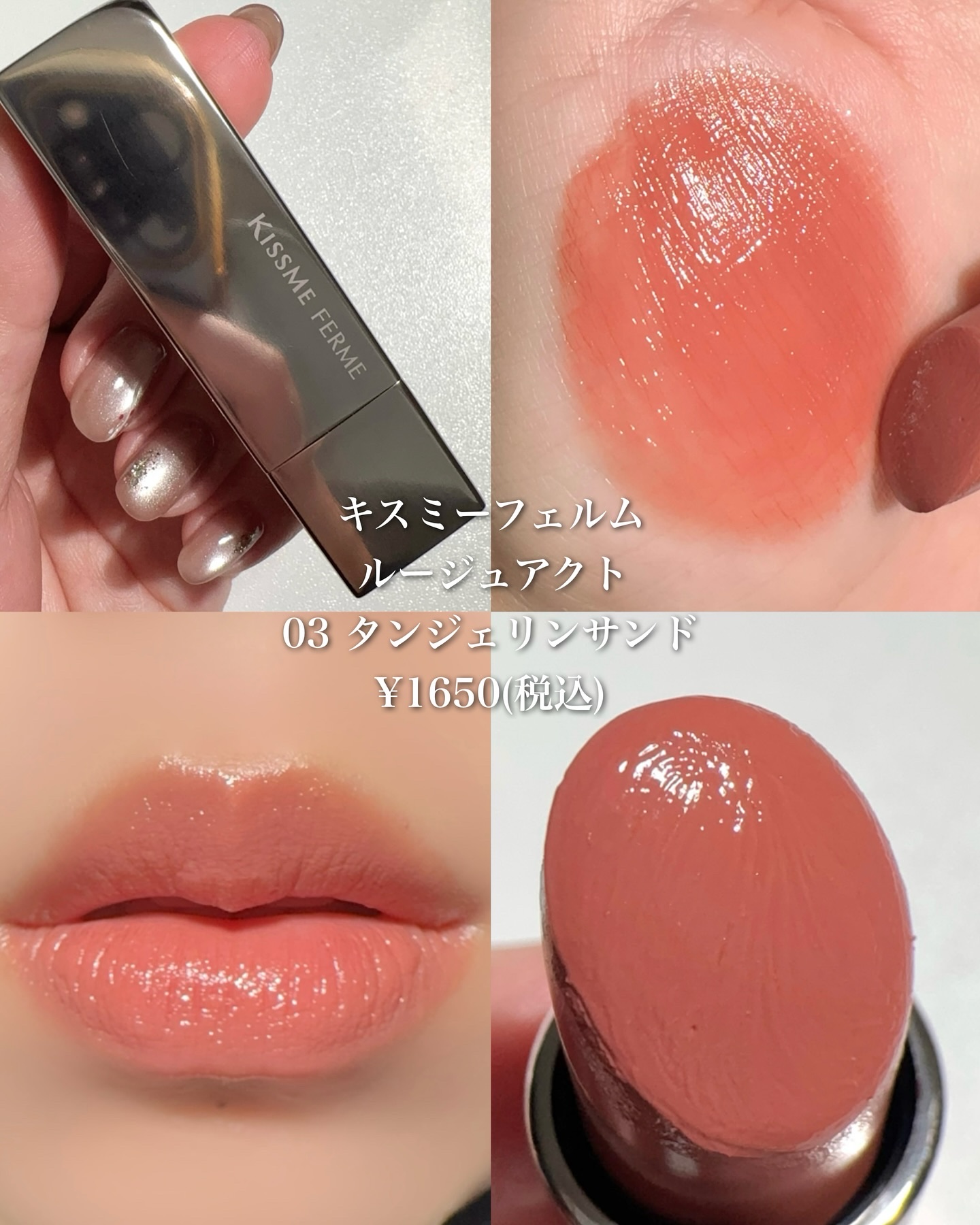 ねっちょりボリューム感あるテクスチャーだけど、ベタつきなく使いやすい。 ティントじゃない普通のグロスだから色もちは良くない。 発色ナチュラルだからこれだけでもいいけど、他のリップと合わせても可愛い!!