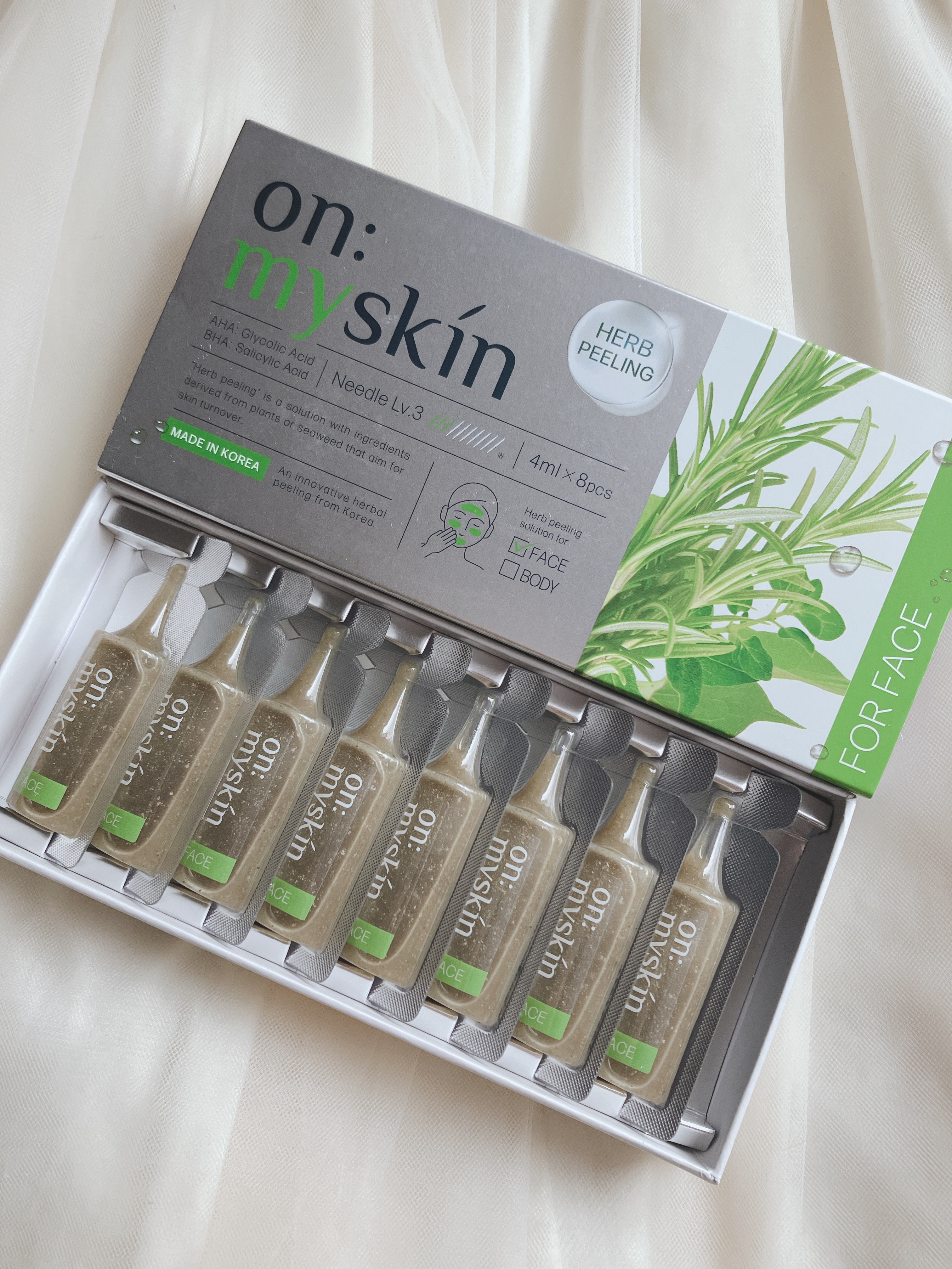 on:myskinハーブピーリングソリューションフェイス用🌿マイクロニードル、AHA/BHA、さらに30種類ものハーブを配合。皮膚科学に基づくトリプル処方の次世代型のケアでより健やかな肌へ✨洗顔後水気を拭き取ったあとに使用するよ。軽く刷り込む...
