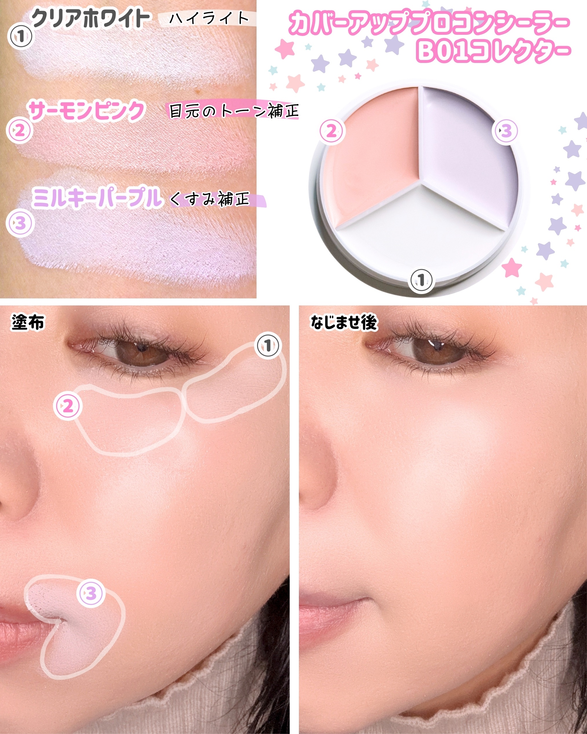 - クマからニキビ跡、シミまでこれ1つでカバー。 3色タイプだからこそ、気になるところや肌色を選ばずにご使用いただけます。 リキッドタイプを圧縮した高濃度バームのため高カバー高密着*¹を実現。 コンシーラーだけでなくコントアとしても使用可能です。 *1メーカー比