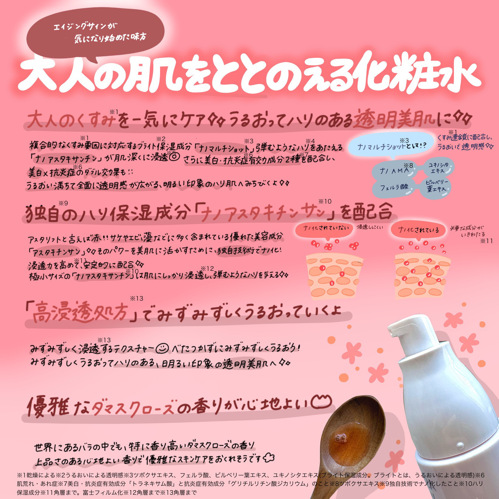 - 【医薬部外品】 肌全層に染みこむ浸透感 みずみずしいうるおい感 ・4つのくすみケア成分からなる「ナノマルチショット」が“くすみ連鎖”を断ち切り、肌全層に透明感をもたらします。 ・抗酸化成分「ナノアスタキサンチン」、厳選された「3種のコラーゲン」、「メマツヨイグサ種子エキス」が肌のコラーゲンを守り、育み、うるおいを与えます。 ・美白・抗炎症有効成分「トラネキサム酸」、抗炎症有効成分「グリチルリチン酸ジカリウム」配合。美白だけでなく、肌トラブルの引き金となる炎症までしっかりケアします。
