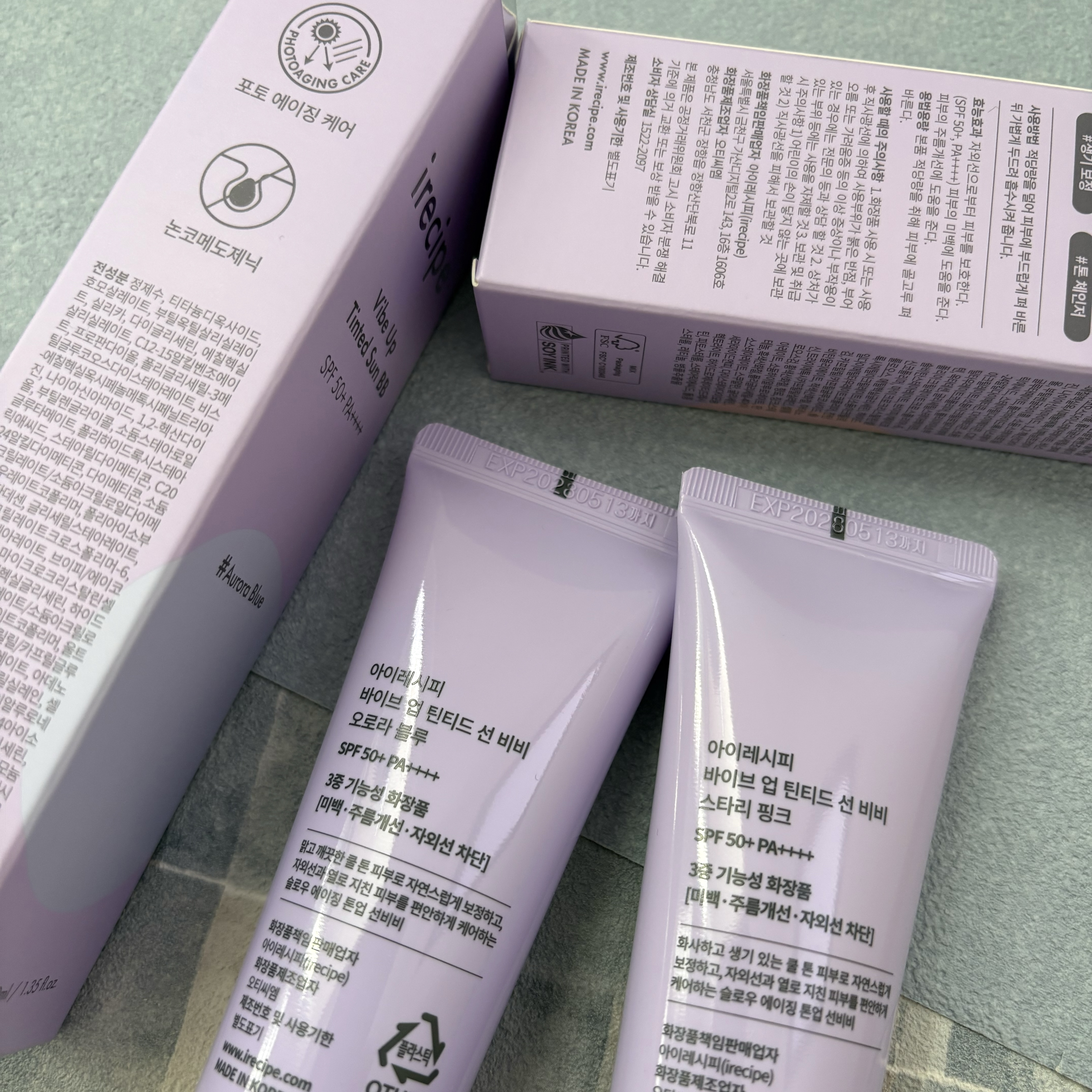 irecipe【アイレシピ】バイブアップティンテッドサンBB・スターリーピンク・オーロラブルー各40mlSPF50+PA++++12月1日発売🆕POINT☑︎軽く密着するクリームテクスチャー☑︎クールトーン向けトーン補正☑︎UVカプセル工法に...