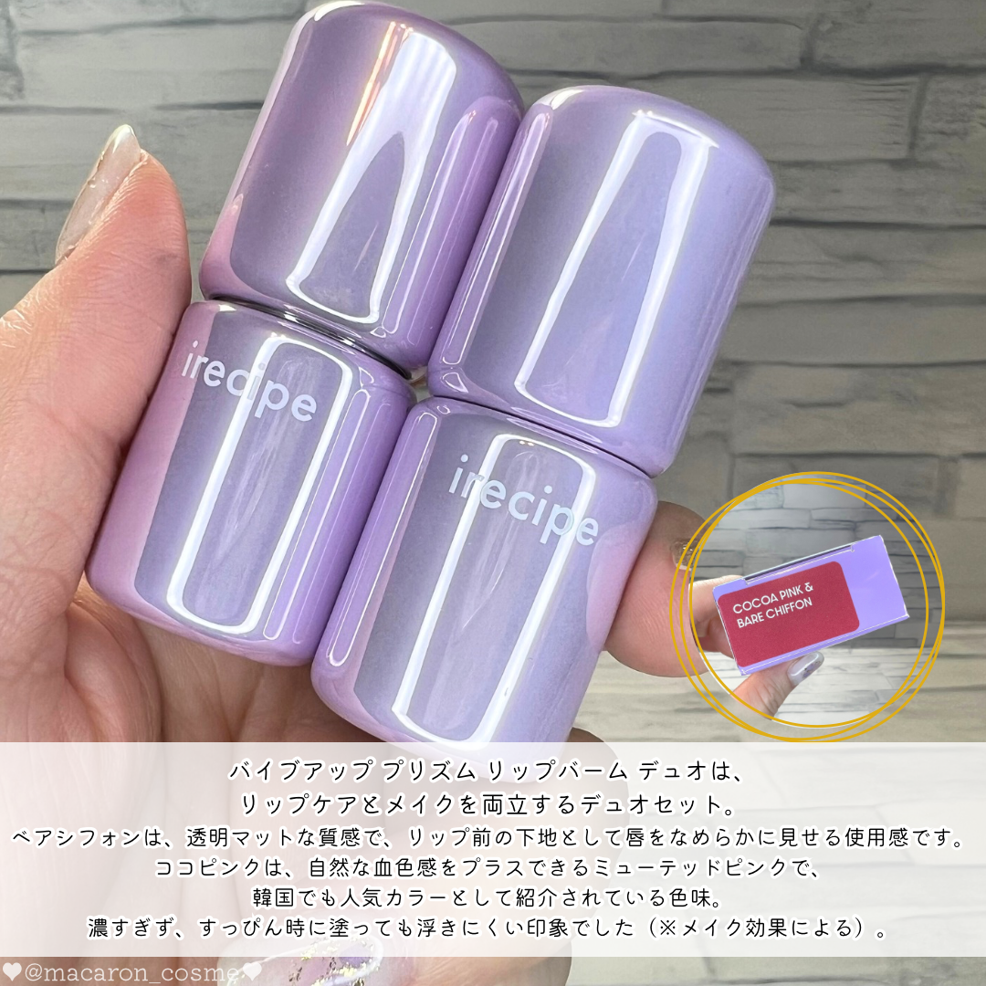 irecipe【アイレシピ】バイブアッププリズムリップバームデュオ(ベアシフォン&ココピンク)リップケア×メイクを両立するデュオ🤍♥️☑︎ベアシフォン→透明マットのリップ下地☑︎ココピンク→自然な血色感のミューテッドピンク☑︎SPF15でデイ...