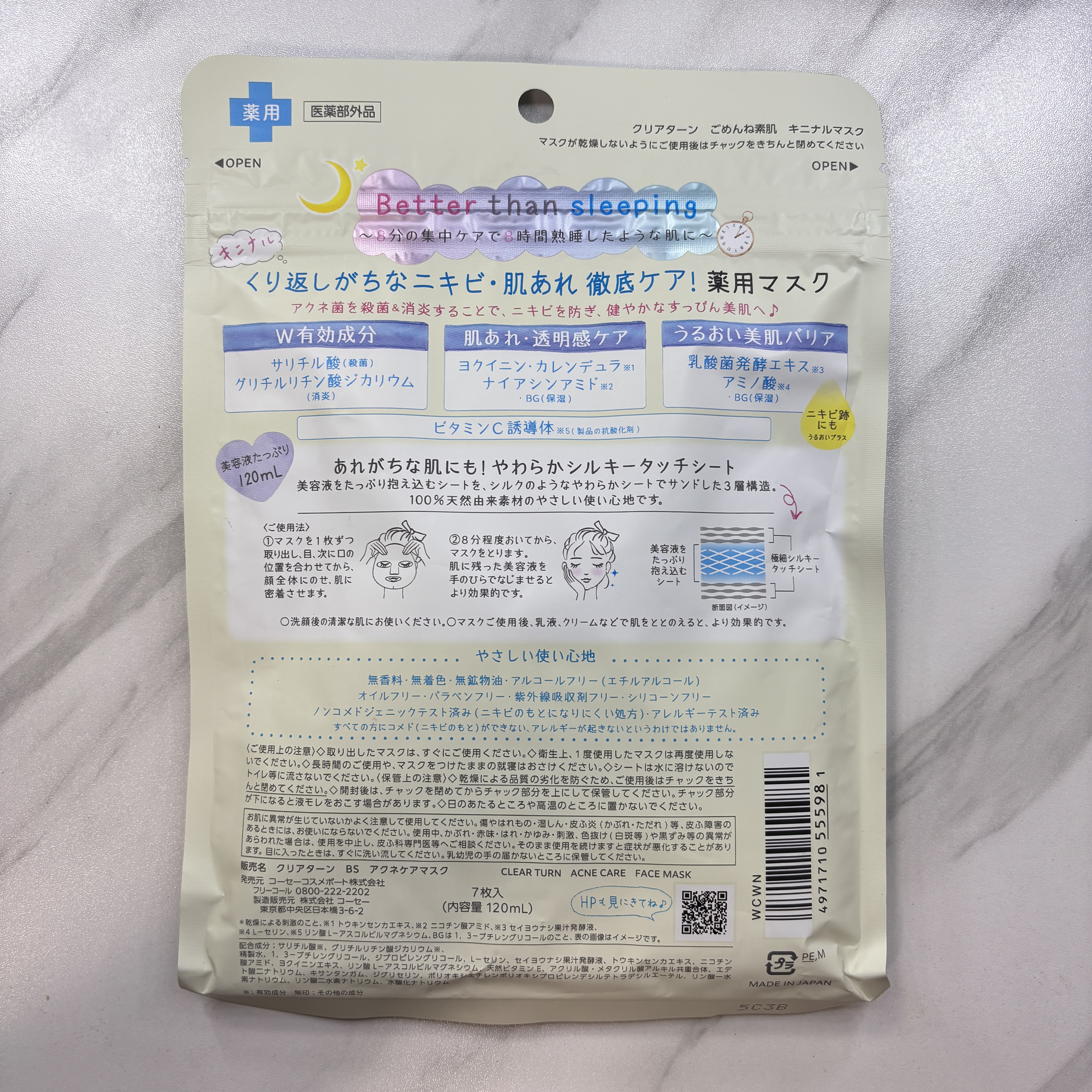 - くり返しがちなニキビ・肌あれ 徹底予防ケア!薬用マスク ①アクネ菌を殺菌&消炎することで、ニキビを防ぎ、健やかなすっぴん肌へ♪ W有効成分:サリチル酸(殺菌)・グリチルリチン酸ジカリウム(消炎) 肌あれ予防・透明感ケア:ヨクイニン・カレンデュラ※1・ナイアシンアミド※2・BG(保湿) うるおい美肌バリア:乳酸菌発酵エキス※3・アミノ酸※4・BG(保湿) ビタミンC誘導体※5(製品の抗酸化剤) ②あれがちな肌にも使える、やさしい使い心地 無香料・無着色・無鉱物油・アルコールフリー(エチルアルコール)・オイルフリー ・パラベンフリー・紫外線吸収剤フリー・シリコーンフリー・グリセリンフリー ノンコメドジェニックテスト済み(ニキビのもとになりにくい処方)・アレルギーテスト済み すべての方にコメド(ニキビのもと)ができない、アレルギーが起きないわけではありません ③やわらかシルキータッチシート 美容液をたっぷり抱え込むシートを、シルクのような柔らかいシートでサンドした3層構造シート。 ※1トウキンセンカエキス ※2 ニコチン酸アミド ※3セイヨウナシ果汁発酵液 ※4L-セリン ※5 リン酸L-アスコルビルマグネシウム、BGは1、3-ブチレングリコールのこと