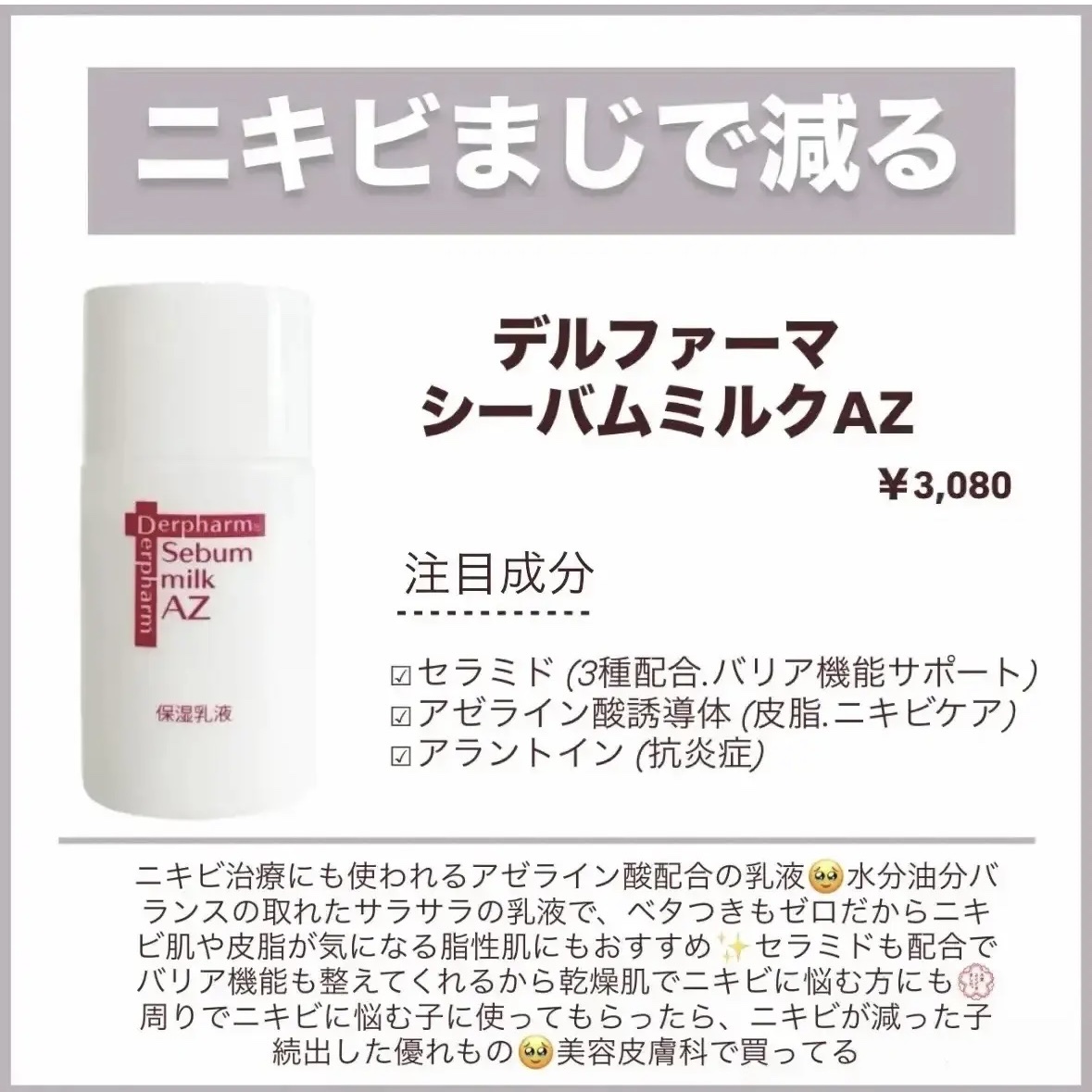 ニキビ跡に驚くほど効果を感じたので今回はその商品の紹介です🥹 これ使うと今あるニキビ跡もマシになるし、新しいニキビも出来にくくなるし🥹 まじいいことしかない、詳しい成分などは画像に記載したのでゆっくりご覧下さい🥹