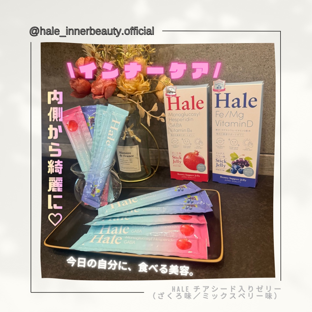 - 「Hale ざくろ味」には、今注目のモノグルコシルヘスぺリジン、GABA、ビタミンB6と美容をサポートする成分を配合し、「Hale ミックスベリー味」には、女性に不足しがちな鉄分、マグネシウム、ビタミンDを配合しています。2品ともに新開発の食べ応えのあるゼリー食感とチアシードのつぶつぶ感を楽しめる美容サポートゼリーです。5本タイプと手軽な1本タイプがあり、外で小腹が空いた時など、カバンに持ち運べるサイズでいつでも楽しむことができます。