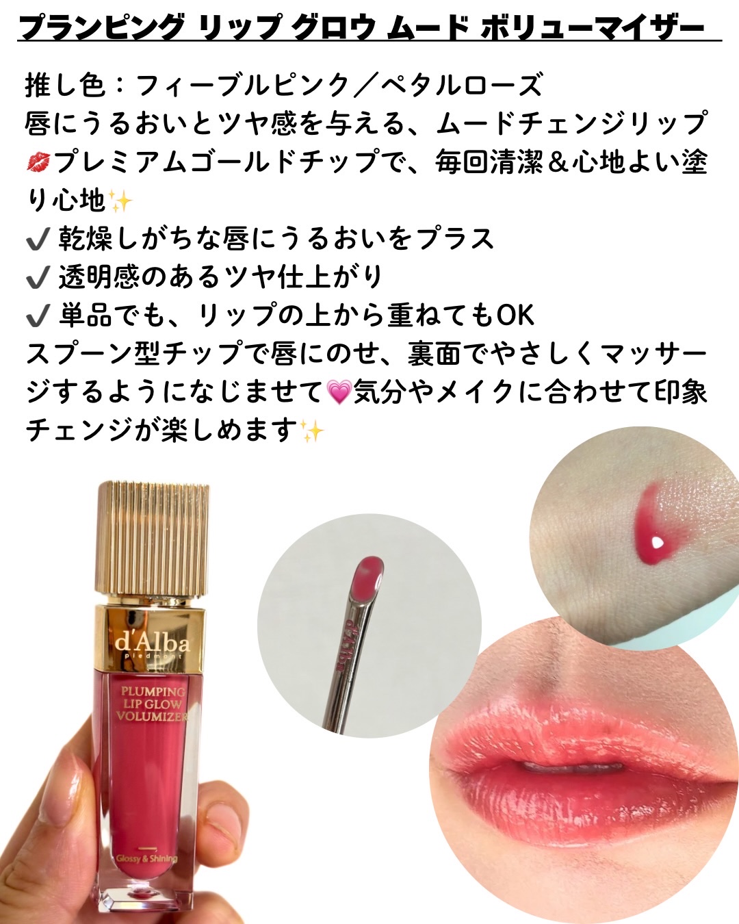 ぷるんとした光沢感:エッジブレンダーを使用した、憧れのぽってりオーバーリップを簡単に実現💄 心地よいグロスオイルティント:素顔にもナチュラルになじむクリアな発色で、乾燥防いで快適✨️ごはんも気にせず食べられる💗 斜めカットタイプのブラシアプリケーター:好きな部分に正確に発色◎ 珍しい筆なので、初めて見たときはびっくり!