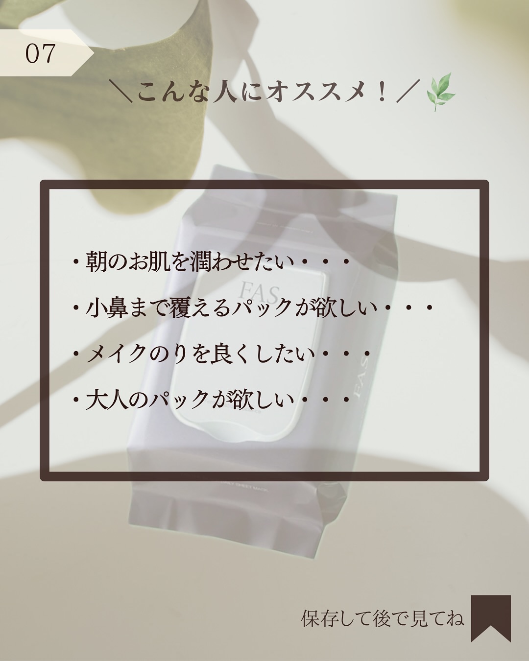 - ・FAS独自成分 精密発酵ナリンゲニン 「精密発酵」という最先端の発酵技術をもちいて、4年をかけて研究し、FAS独自成分「精密発酵ナリンゲニン(保湿成分)」を完成させました。1日5分間のケアで、朝使えば外的環境に触れる前の肌を整え、夜使えばダメージをその日のうちに潤いでケアしてくれます。 ・シート形状をオリジナルで開発 肌あたりがソフトで軽く、液をたっぷり含んで逃さないマイクロファイバーストレッチシートを採用し、顔の凹凸にぴったり寄り添うオリジナル形状を開発しました。骨格を問わないフィット感を実現し、気になる小鼻まわりにも密着します。 ・デイリーケアに適した中容量タイプ さっと手早く使えて、最初から最後まで適量で使えるように、10枚入りという中容量にこだわりました。忙しいときほど、高機能なシートマスクで肌をしっかりケアしていただけます。