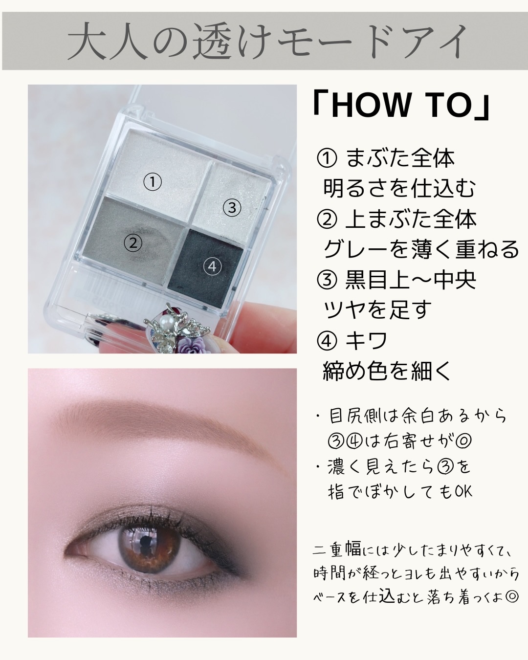 彩度ひくめのミュートメイクが叶う、ちふれのプチプラアイシャドウ♡ 透き通るような陰影がキレイで、コントラストが高め。旬の目元に仕上げてくれる🥹 裏側にオススメの塗り方通りがかいてあるのも◎