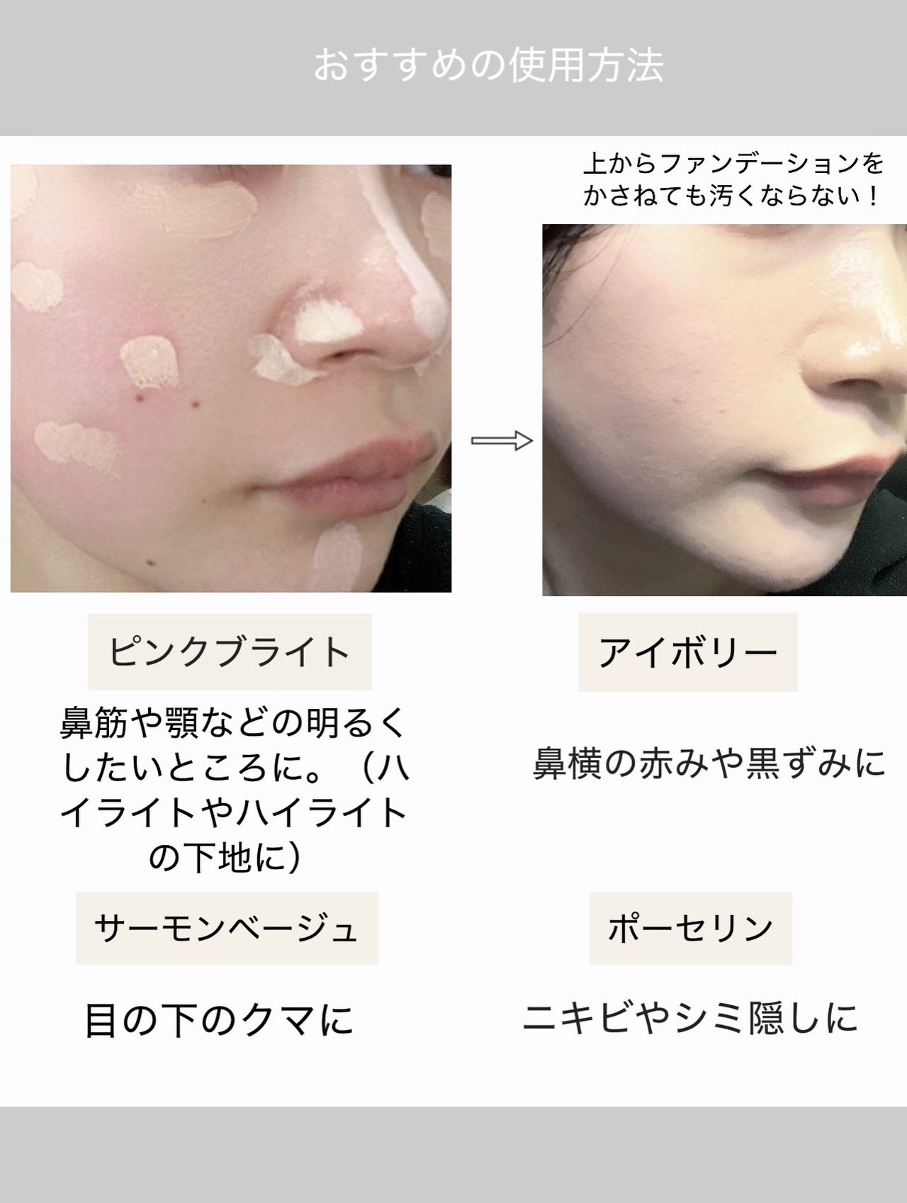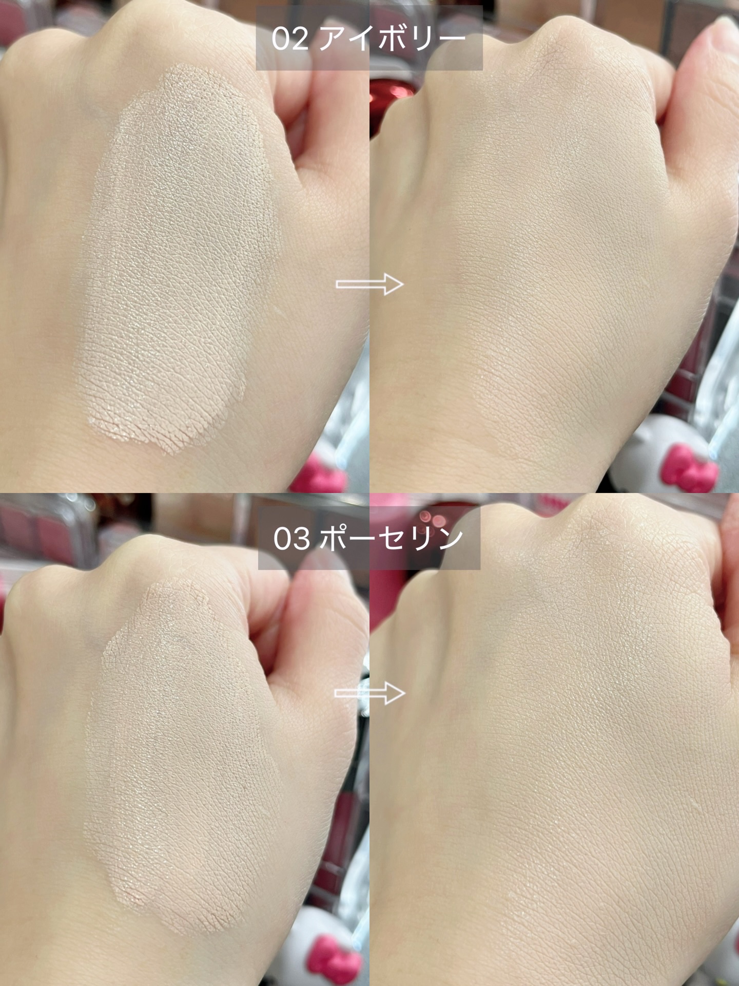 - <00 ピンクブライト> トリ(カプリル酸/カプリン酸)グリセリル、オクチルドデカノール、ヤシ油脂肪酸デシル、ダイマージリノール酸水添ヒマシ油、ポリブテン、合成ワックス、ヒマワリ種子ロウ、ラウリン酸ヘキシル、リンゴ種子油、イソステアリン酸ソルビタン、ポリヒドロキシステアリン酸、ツバキ種子油、シリカ、パルミチン酸エチルヘキシル、ミリスチン酸イソプロピル、イソステアリン酸、レシチン、ステアラルコニウムヘクトライト、ポリリシノレイン酸ポリグリセリル-3、香料、ジミリスチン酸Al、炭酸プロピレン、(ビニルジメチコン/メチコンシルセスキオキサン)クロスポリマー、カプリリルグリコール、カプリル酸グリセリル、加水分解ヒアルロン酸、マデカッソシド、ナイアシンアミド、PCA亜鉛、水、グリセリン、1,2-ヘキサンジオール、水溶性コラーゲン、酸化チタン、マイカ、酸化鉄 <01 サーモンベージュ> トリ(カプリル酸/カプリン酸)グリセリル、オクチルドデカノール、ヤシ油脂肪酸デシル、ダイマージリノール酸水添ヒマシ油、ポリブテン、合成ワックス、ヒマワリ種子ロウ、ラウリン酸ヘキシル、リンゴ種子油、イソステアリン酸ソルビタン、ポリヒドロキシステアリン酸、ツバキ種子油、シリカ、レシチン、パルミチン酸エチルヘキシル、ミリスチン酸イソプロピル、イソステアリン酸、ステアラルコニウムヘクトライト、ポリリシノレイン酸ポリグリセリル-3、香料、炭酸プロピレン、(ビニルジメチコン/メチコンシルセスキオキサン)クロスポリマー、ジミリスチン酸Al、カプリリルグリコール、カプリル酸グリセリル、加水分解ヒアルロン酸、マデカッソシド、ナイアシンアミド、PCA亜鉛、水、グリセリン、1,2-ヘキサンジオール、水溶性コラーゲン、酸化チタン、マイカ、酸化鉄 <02 アイボリー> トリ(カプリル酸/カプリン酸)グリセリル、オクチルドデカノール、ヤシ油脂肪酸デシル、ダイマージリノール酸水添ヒマシ油、ポリブテン、合成ワックス、ヒマワリ種子ロウ、ラウリン酸ヘキシル、リンゴ種子油、イソステアリン酸ソルビタン、ポリヒドロキシステアリン酸、ツバキ種子油、シリカ、レシチン、パルミチン酸エチルヘキシル、ミリスチン酸イソプロピル、イソステアリン酸、ステアラルコニウムヘクトライト、ポリリシノレイン酸ポリグリセリル-3、香料、ジミリスチン酸Al、炭酸プロピレン、(ビニルジメチコン/メチコンシルセスキオキサン)クロスポリマー、カプリリルグリコール、カプリル酸グリセリル、加水分解ヒアルロン酸、マデカッソシド、ナイアシンアミド、PCA亜鉛、水、グリセリン、1,2-ヘキサンジオール、水溶性コラーゲン、酸化チタン、マイカ、酸化鉄 <03 ポーセリン> トリ(カプリル酸/カプリン酸)グリセリル、オクチルドデカノール、ヤシ油脂肪酸デシル、ダイマージリノール酸水添ヒマシ油、ポリブテン、合成ワックス、ヒマワリ種子ロウ、ラウリン酸ヘキシル、リンゴ種子油、イソステアリン酸ソルビタン、ポリヒドロキシステアリン酸、ツバキ種子油、シリカ、レシチン、パルミチン酸エチルヘキシル、ミリスチン酸イソプロピル、イソステアリン酸、ステアラルコニウムヘクトライト、ポリリシノレイン酸ポリグリセリル-3、香料、ジミリスチン酸Al、炭酸プロピレン、(ビニルジメチコン/メチコンシルセスキオキサン)クロスポリマー、カプリリルグリコール、カプリル酸グリセリル、加水分解ヒアルロン酸、マデカッソシド、ナイアシンアミド、PCA亜鉛、水、グリセリン、1,2-ヘキサンジオール、水溶性コラーゲン、酸化チタン、マイカ、酸化鉄