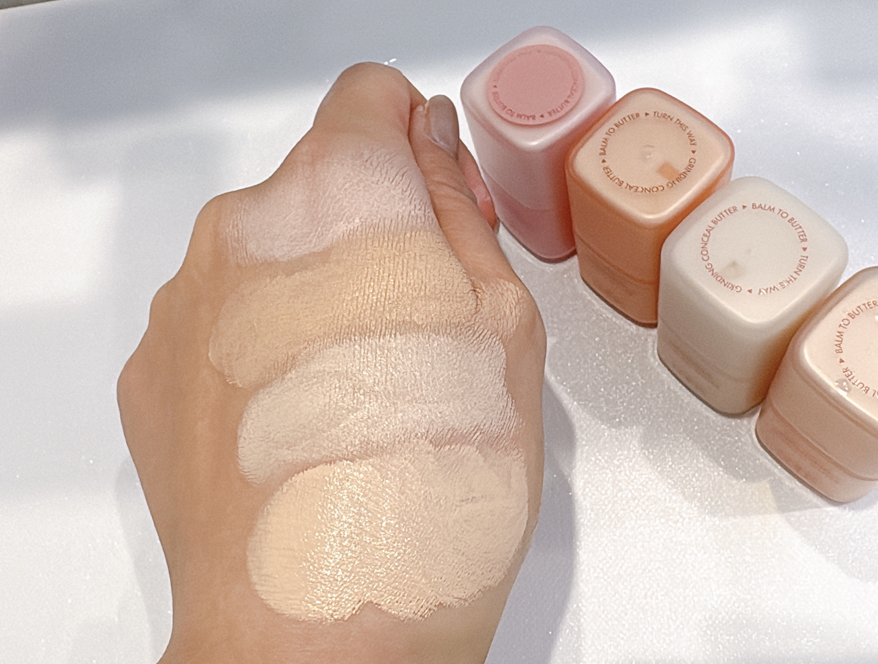 \バターのようになめらかに、とろけて密着カバー/LUNA♡♡グラインディングコンシールバター全色レビュー✨️⋆⋆▶00ピンクブライトハイライト用におすすめハイライトに特化した高明度ピンクカラー▶01サーモンベージュ22号&クマカバー用におすす...
