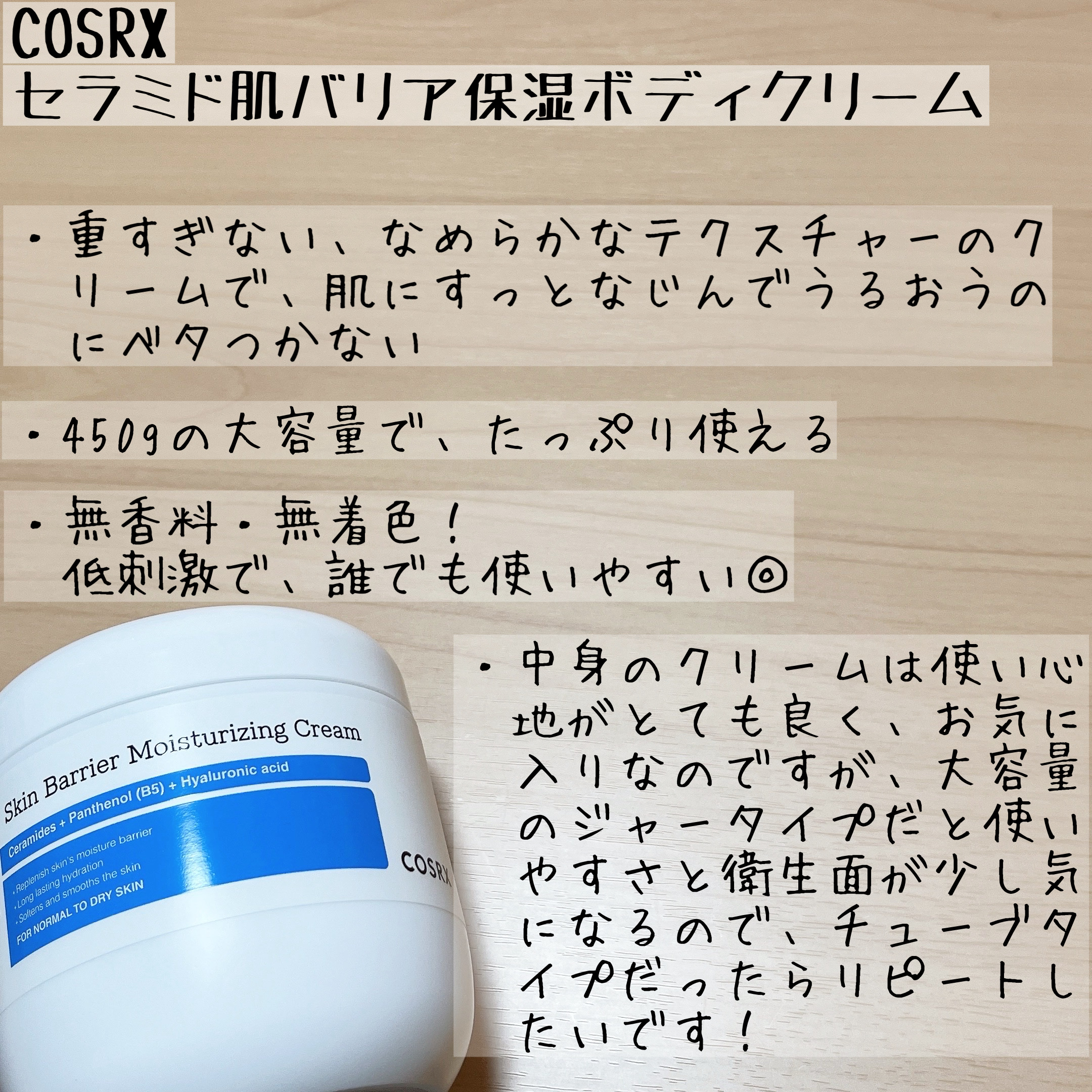 COSRXXの一年分当選でいただいた😘セラミド肌バリア保湿ボディクリーム(450g)乾燥しやすい季節の全身保湿用に使いやすい大容量タイプのボディクリーム。無香料・無着色・無添加処方で、肌がゆらぎやすい時期にも手に取りやすいセラミド配合肌のうる...