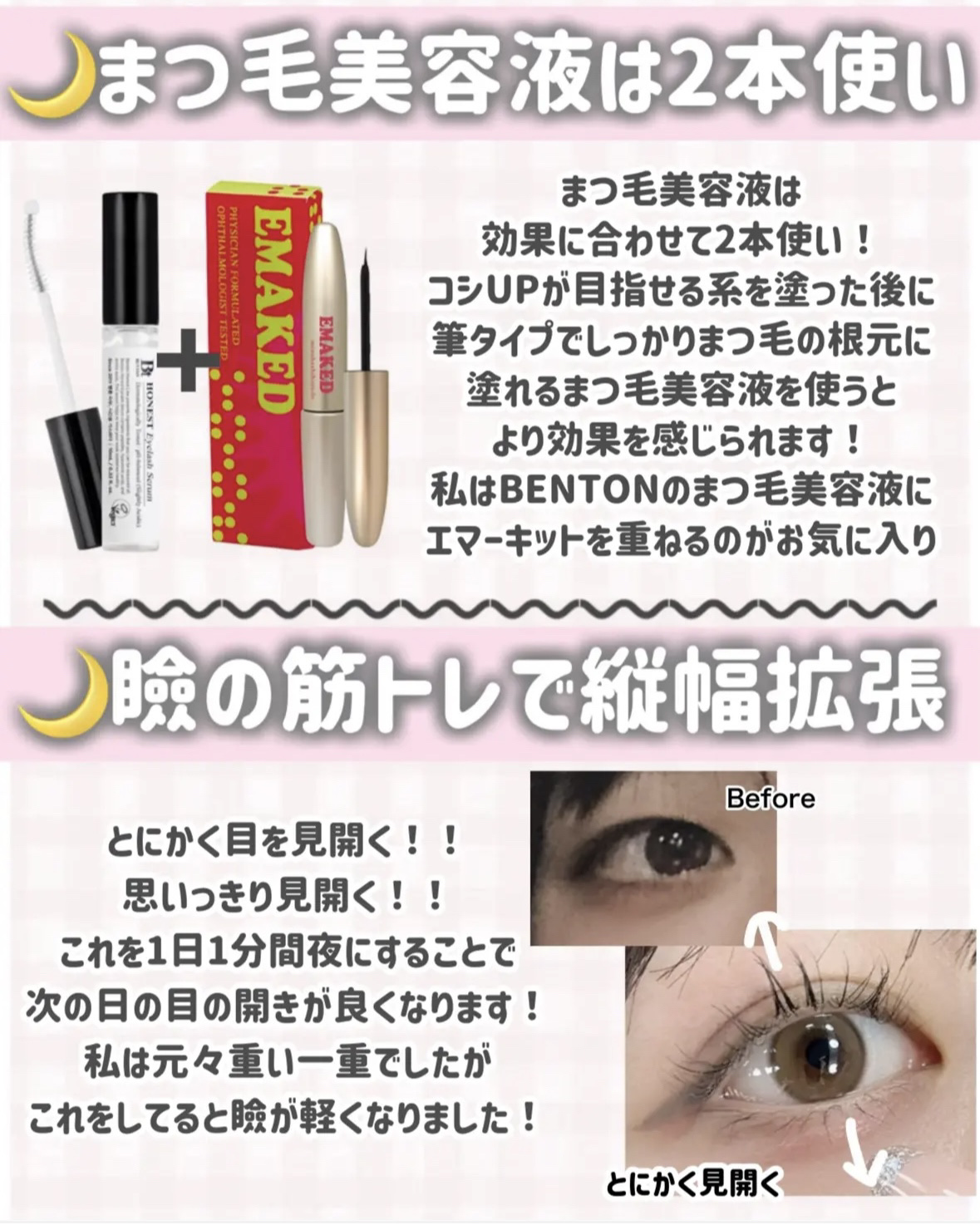 【瞼の筋トレ】について詳しく解説!!これさえすれば絶対変われます!!!瞼の筋トレって?という方は、画像をご覧下さい‼️これがないと私は今頃二重になってなかった…と言っても過言ではないくらい、私の癖付けには欠かせなかったものです!!今回は、昔からしている筋トレ1つと、最近思いついて実践している筋トレ2つをご紹介します!!どれもすごく簡単なので、ぜひ試してみてください📷Q 一日どのくらいしてた?A とにかく暇さえあればしていました!!1日30分の日もあれば、何時間もする日もありましたこの筋トレは、お風呂に入りながらや勉強しながら、スマホ見ながらでもできるのがいいところなので、スキマ時間を上手く活用するのがいいかな思います💭Q 今まで何回くらい筋肉痛になった?A 左右どちらも5回くらいだと思います!瞼が私より軽い方は、1、2回で十分スッキリすると思いますよ❣️Q どれくらいで筋肉痛になった?A 筋肉痛までは平均して2週間くらいかかりました!でもフォロワーさんの中には1日でなられた方も多くいらっしゃいますなのでその人の瞼や頑張り次第だと思います❣️Q 筋トレ1