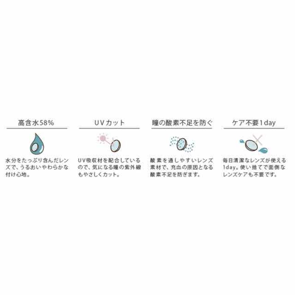 - 派手すぎず、ナチュラルすぎない 絶妙なバランスのレンズデザインにこだわった「おしゃ盛りレンズ」 DIA : 14.2mm 着色外径 : 13.6 mm BC : 8.5mm 含水率 : 58% 度あり 度なし カラーコンタクトレンズの不適正使用による眼障害の危険性等などがあります。 ●コンタクトレンズは高度管理医療機器です。不十分な洗浄・消毒など不適切なケアや、長時間・交換期間を超えた装用により、アレルギー性結膜炎、角膜感染症、角膜潰瘍等の重篤な眼障害が発生する危険性があります ●ご使用前に取扱説明書を確認してください 使用上の留意事項 ●眼科医院等を受診してからお求めください ●眼に異常を感じたら直ちにレンズ使用を中止し、お近くの眼科等で診察を受けてください ●医師の指示にしたがってご使用ください ●コンタクトレンズを装用する場合、自覚症状がなくても、眼科医院等での定期検査を受けてください ●レンズに不具合がある場合は使用しないでください