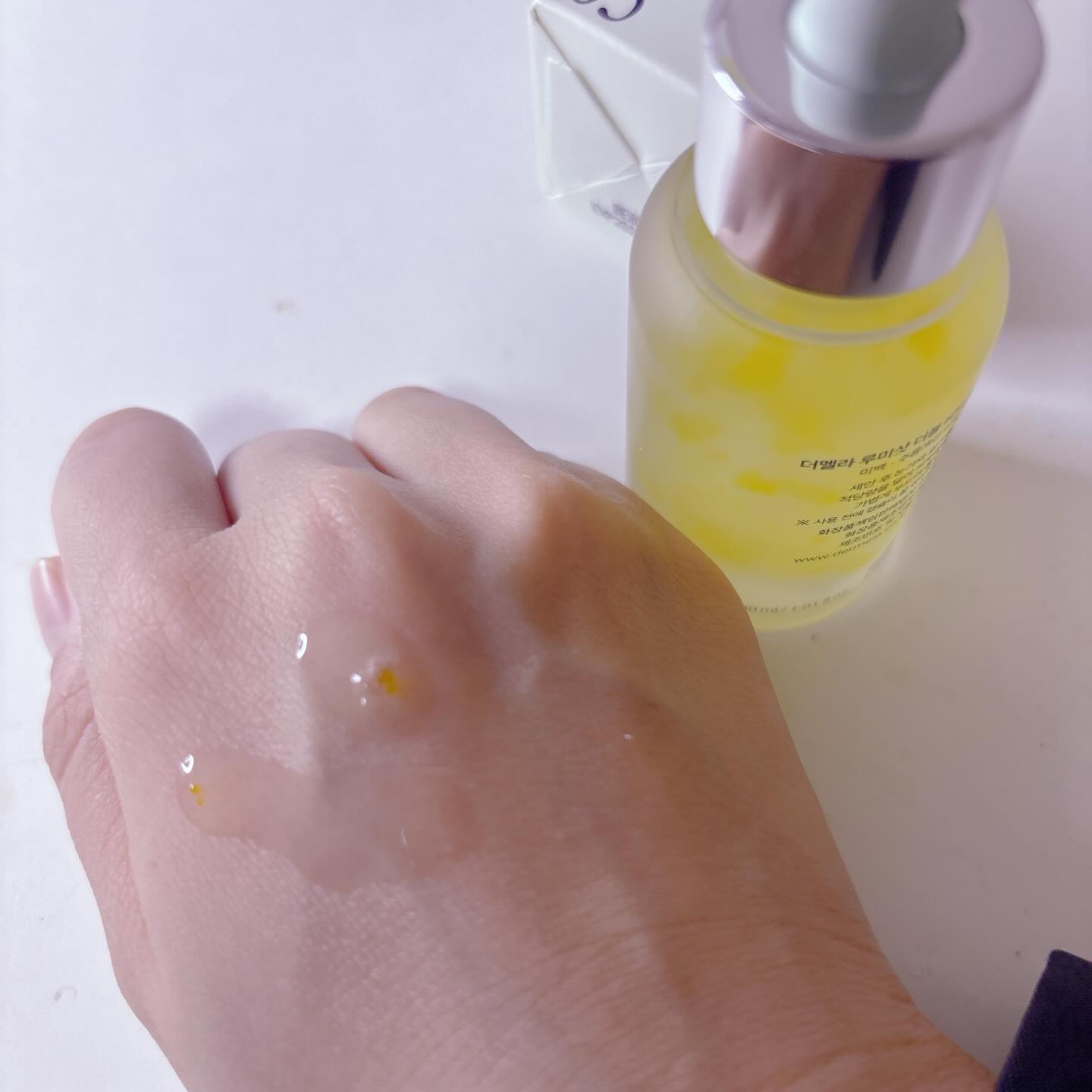 手に取ってみると、なめらかな感触で伸びがいいです。乗せた時密着感があります。 テクスチャは軽く肌馴染みが良く、軽くトーンアップしてくれます。 薄いオレンジ色ぽい感じで、薄い色のシミを少し隠してくれる感じです。 他のファンデーションと重ねてもモロモロがでるとかムラになるとかもなかったので使いやすいです。 手に取ると淡いベージュ色だけど、肌に乗せてみると白っぽくなり、肌色補整とトーンアップ効果があります。 日焼け止め効果もしっかりあるのでひとつあると便利かも。