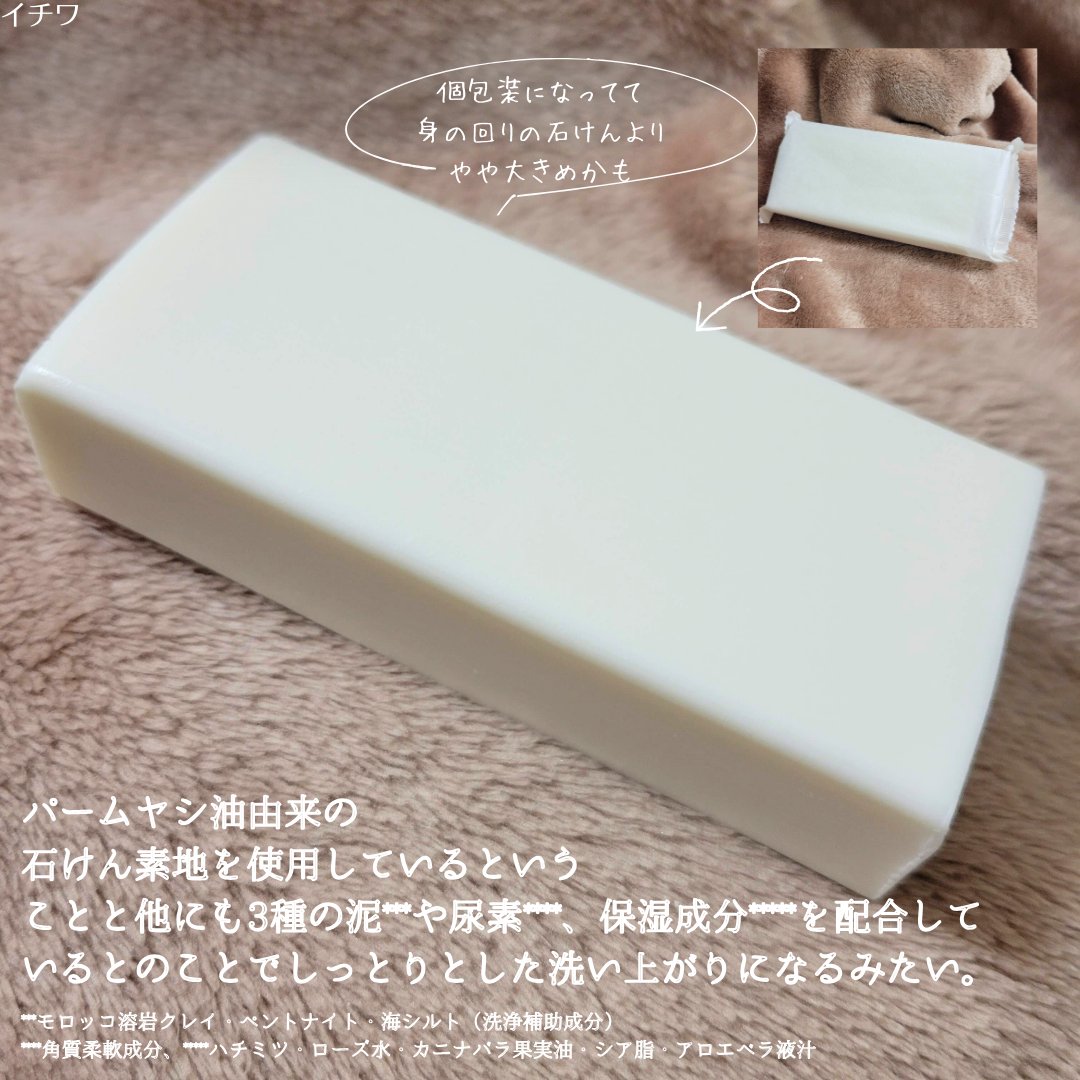 - 石ケン素地、水、パーム脂肪酸、炭酸水素Na、パーム核脂肪酸、尿素、モロッコ溶岩クレイ、ベントナイト、海シルト、ハチミツ、サトウカエデ樹液、ローズ水、ローズヒップ油、シア脂、アロエベラ液汁、グリチルリチン酸2K、グリセリン、トレハロース、クエン酸、塩化Na、酸化チタン、BG、EDTA-4Na、エチドロン酸、エチドロン酸4Na、フェノキシエタノール、香料
