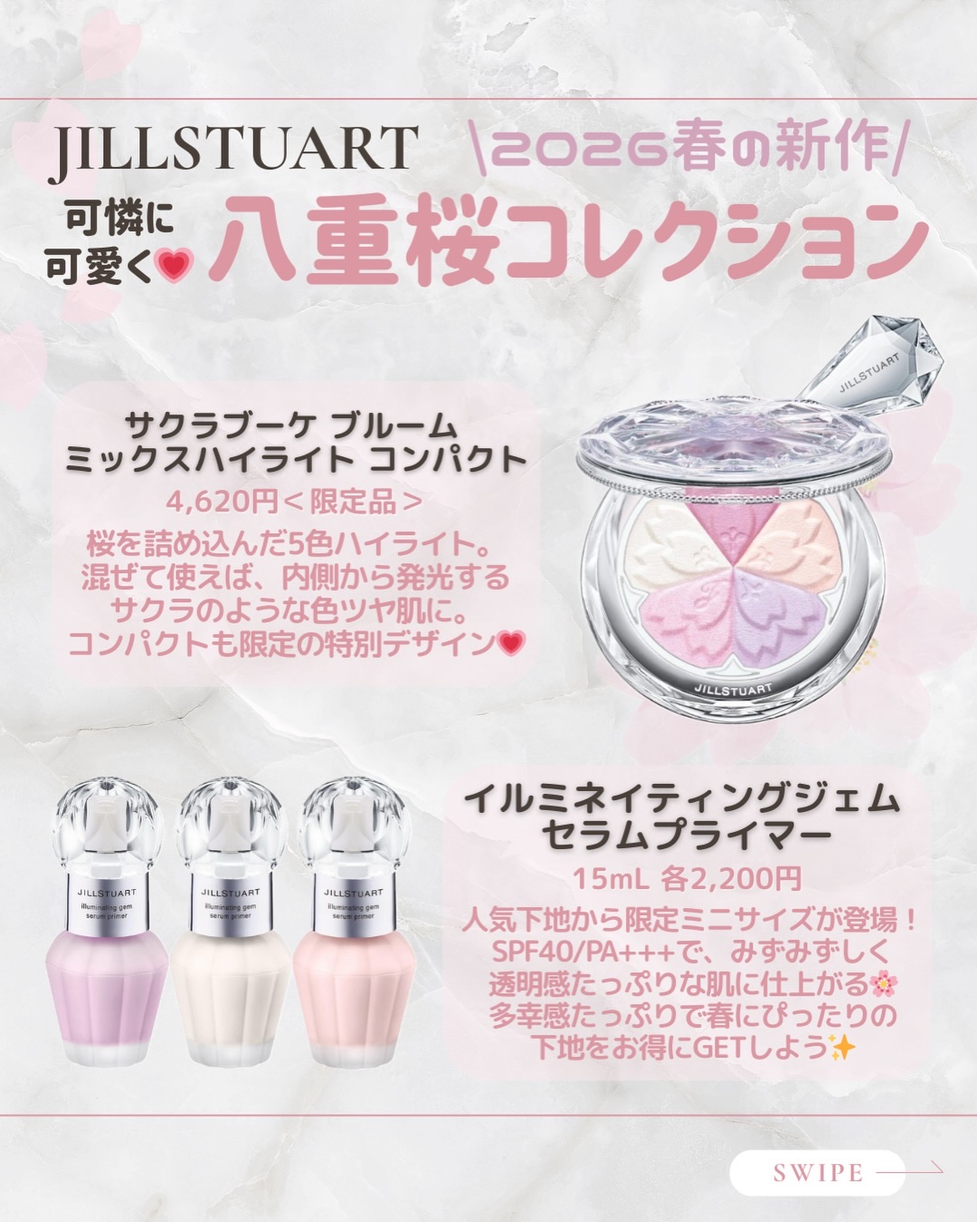 ジルスチュアートクリスタルブルームリップブーケ セラム ¥3,740 111 happiness petal pink<サクラブーケ> クリスタルブルーム サクラブーケ オードパルファン 10周年記念デザイン ¥6,270 ジルスチュアート サクラブーケ ヘアミルク ¥2,420