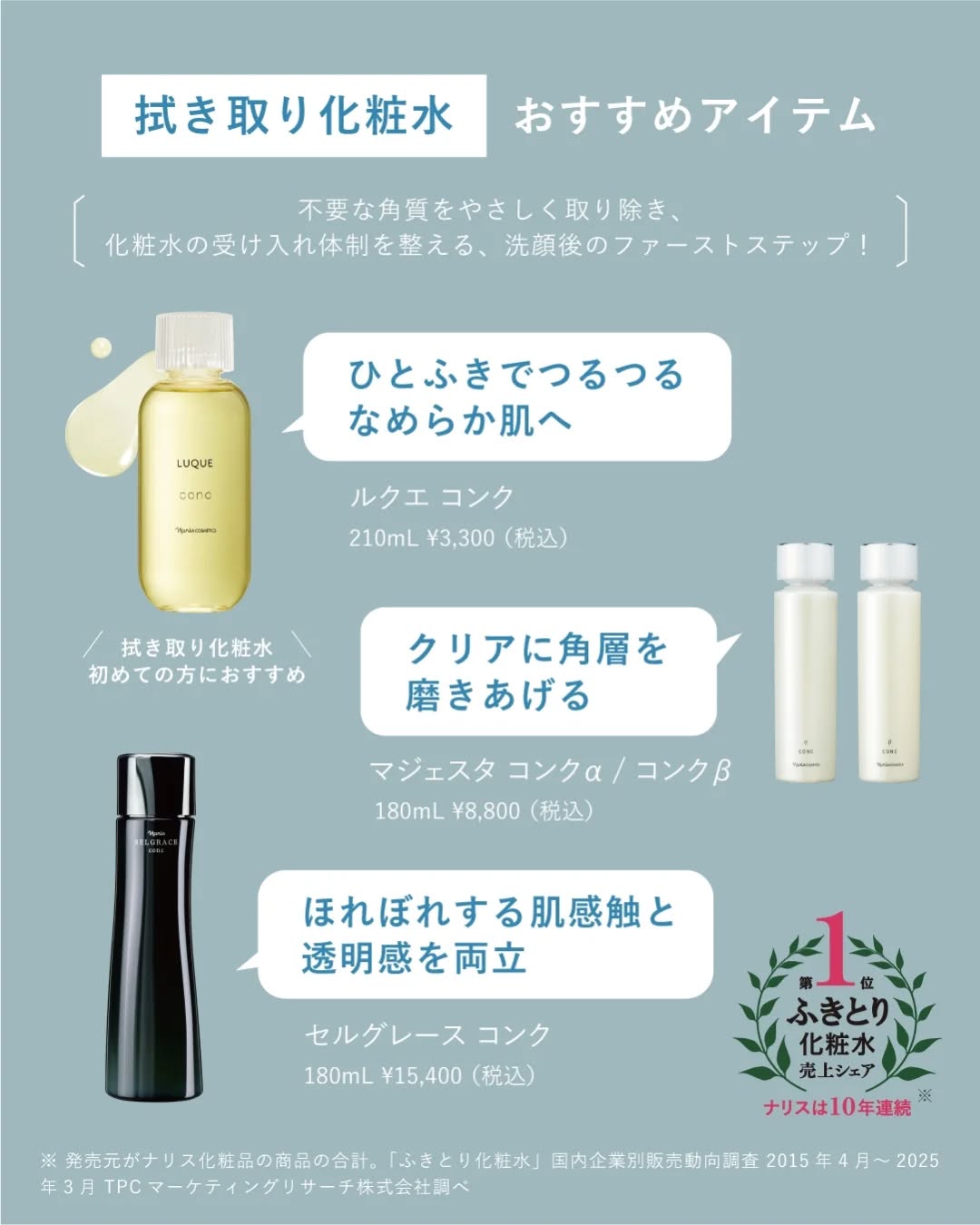ナリス化粧品の原点でもある、拭き取り化粧水。1937年の初代コンクの発売から85年以上続く角層研究の中で様々なお声を頂きながら着実に成長してきました🌱ナリスの拭き取り化粧水は、おかげさまで10年連続売上シェアNo.1*を獲得✨あなたの肌にぴっ...