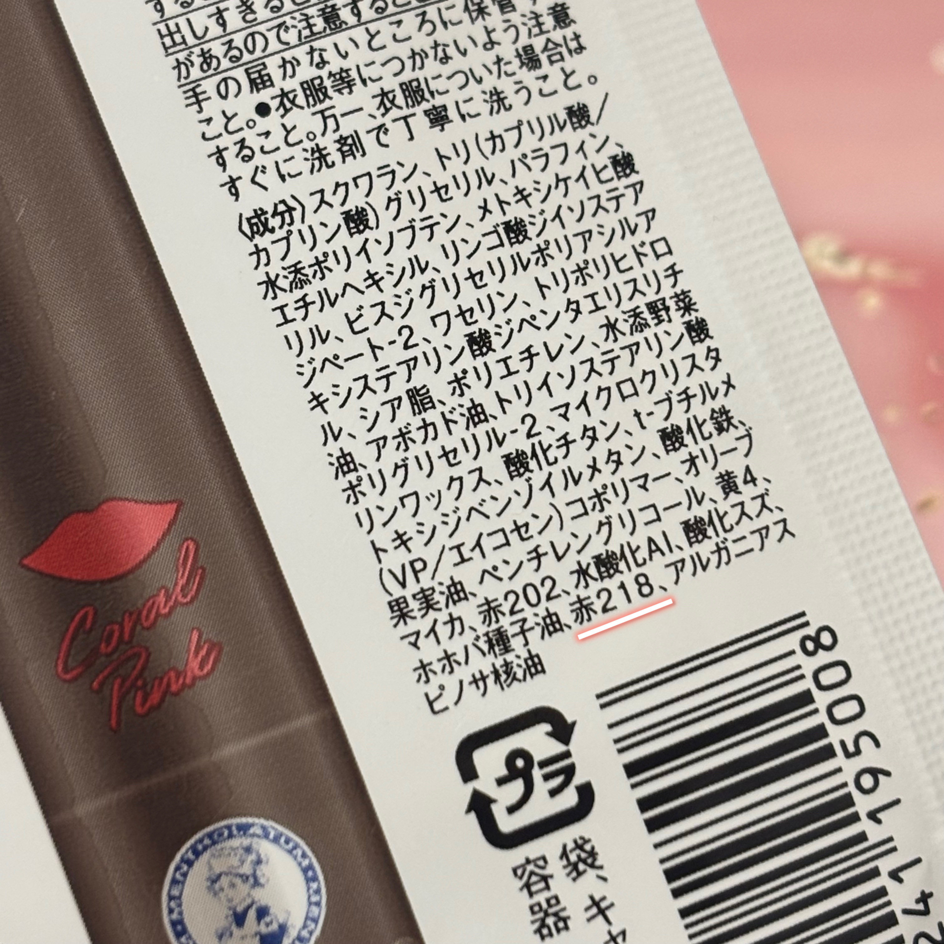 - <ピンク> スクワラン、トリ(カプリル酸/カプリン酸)グリセリル、パラフィン、水添ポリイソブテン、リンゴ酸ジイソステアリル、メトキシケイヒ酸エチルヘキシル、ビスジグリセリルポリアシルアジペート-2、トリポリヒドロキシステアリン酸ジペンタエリスリチル、ワセリン、シア脂、ポリエチレン、水添野菜油、アボカド油、トリイソステアリン酸ポリグリセリル-2、マイクロクリスタリンワックス、t-ブチルメトキシジベンゾイルメタン、オリーブ果実油、(VP/エイコセン)コポリマー、酸化チタン、ペンチレングリコール、黄4、赤202、赤201、マイカ、赤218、ホホバ種子油、アルガニアスピノサ核油、水酸化Al、酸化スズ <ブラウン> スクワラン、トリ(カプリル酸/カプリン酸)グリセリル、パラフィン、水添ポリイソブテン、メトキシケイヒ酸エチルヘキシル、リンゴ酸ジイソステアリル、ビスジグリセリルポリアシルアジペート-2、トリポリヒドロキシステアリン酸ジペンタエリスリチル、ワセリン、シア脂、ポリエチレン、水添野菜油、アボカド油、トリイソステアリン酸ポリグリセリル-2、マイクロクリスタリンワックス、t-ブチルメトキシジベンゾイルメタン、酸化鉄、(VP/エイコセン)コポリマー、オリーブ果実油、青1、ペンチレングリコール、酸化チタン、マイカ、赤223、ホホバ種子油、アルガニアスピノサ核油、酸化スズ <ベージュ> スクワラン、トリ(カプリル酸/カプリン酸)グリセリル、パラフィン、水添ポリイソブテン、リンゴ酸ジイソステアリル、メトキシケイヒ酸エチルヘキシル、ビスジグリセリルポリアシルアジペート-2、トリポリヒドロキシステアリン酸ジペンタエリスリチル、ワセリン、シア脂、ポリエチレン、水添野菜油、アボカド油、トリイソステアリン酸ポリグリセリル-2、マイクロクリスタリンワックス、t-ブチルメトキシジベンゾイルメタン、酸化チタン、酸化鉄、(VP/エイコセン)コポリマー、オリーブ果実油、ペンチレングリコール、マイカ、黄4、赤202、酸化スズ、水酸化Al、赤223、ホホバ種子油、アルガニアスピノサ核油 <レッド> スクワラン、トリ(カプリル酸/カプリン酸)グリセリル、パラフィン、水添ポリイソブテン、リンゴ酸ジイソステアリル、メトキシケイヒ酸エチルヘキシル、ビスジグリセリルポリアシルアジペート-2、トリポリヒドロキシステアリン酸ジペンタエリスリチル、ワセリン、シア脂、ポリエチレン、水添野菜油、アボカド油、トリイソステアリン酸ポリグリセリル-2、マイクロクリスタリンワックス、t-ブチルメトキシジベンゾイルメタン、(VP/エイコセン)コポリマー、オリーブ果実油、酸化チタン、ペンチレングリコール、黄4、赤201、マイカ、赤202、酸化スズ、赤218、ホホバ種子油、アルガニアスピノサ核油 <オレンジ> スクワラン、トリ(カプリル酸/カプリン酸)グリセリル、パラフィン、水添ポリイソブテン、リンゴ酸ジイソステアリル、メトキシケイヒ酸エチルヘキシル、ビスジグリセリルポリアシルアジペート-2、トリポリヒドロキシステアリン酸ジペンタエリスリチル、ワセリン、シア脂、ポリエチレン、水添野菜油、アボカド油、トリイソステアリン酸ポリグリセリル-2、マイクロクリスタリンワックス、t-ブチルメトキシジベンゾイルメタン、酸化鉄、(VP/エイコセン)コポリマー、オリーブ果実油、ペンチレングリコール、黄4、酸化チタン、マイカ、赤223、ホホバ種子油、アルガニアスピノサ核油、酸化スズ