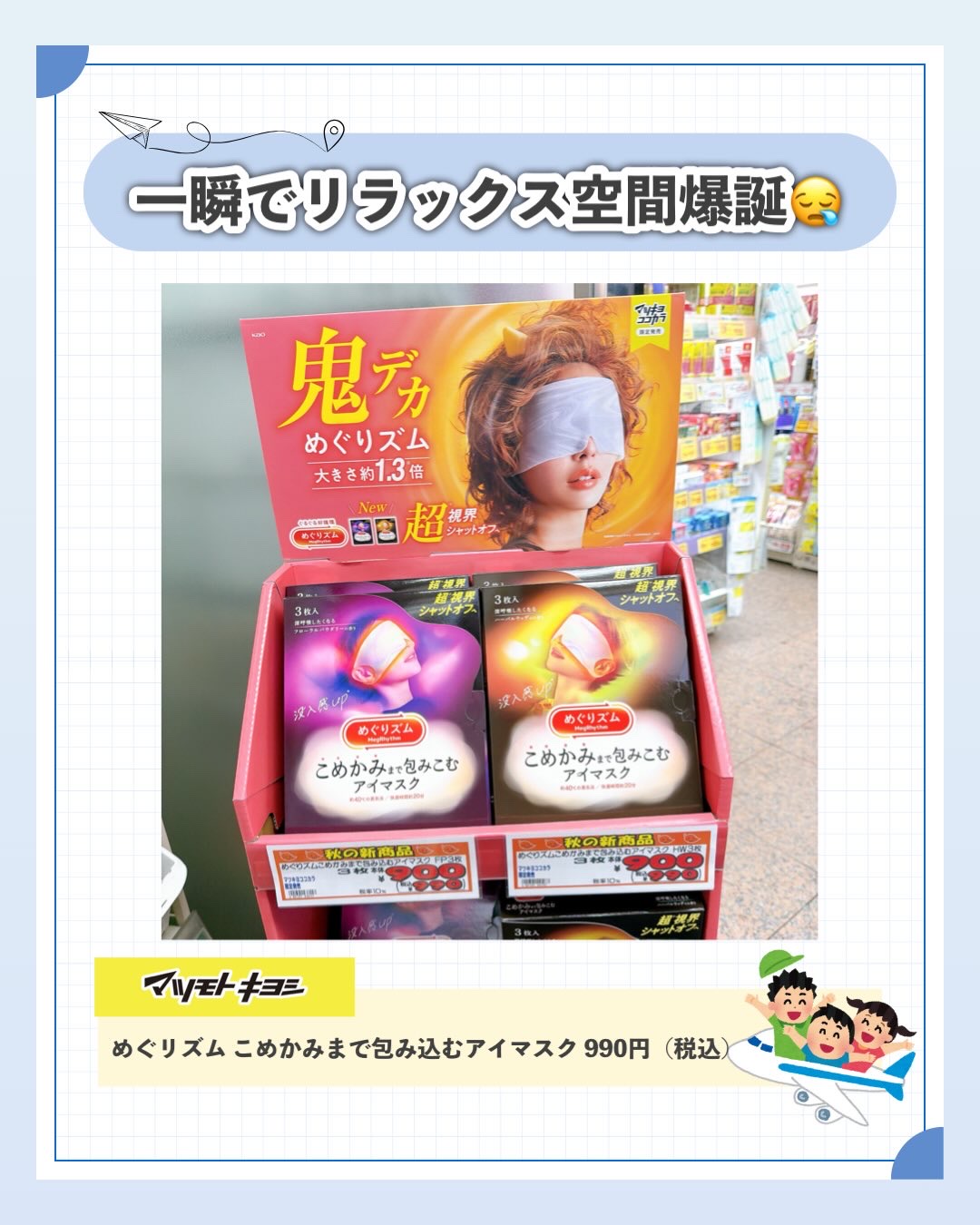プレゼントキャンペーンでいただきました。こめかみまで包みこむアイマスク!通常の1.3倍の大きさで、すっぽり覆われている安心感があり安眠できました😴香りも好みの香りで癒されました✨また使いたい!#めぐリズム#目元ケア...
