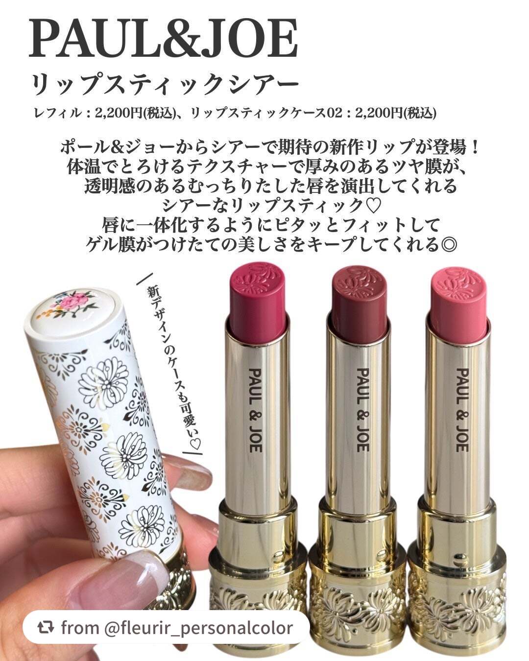 話題のポルジョ新作リップブルベ推し3選♡PAUL&JOE#リップスティックシアー レフィル:2,200円(税込)リップスティックケース02:2,200円(税込)02ロコココスタイル05バンデソン07リドゥベベポール&ジョーからシアーで期待の新...
