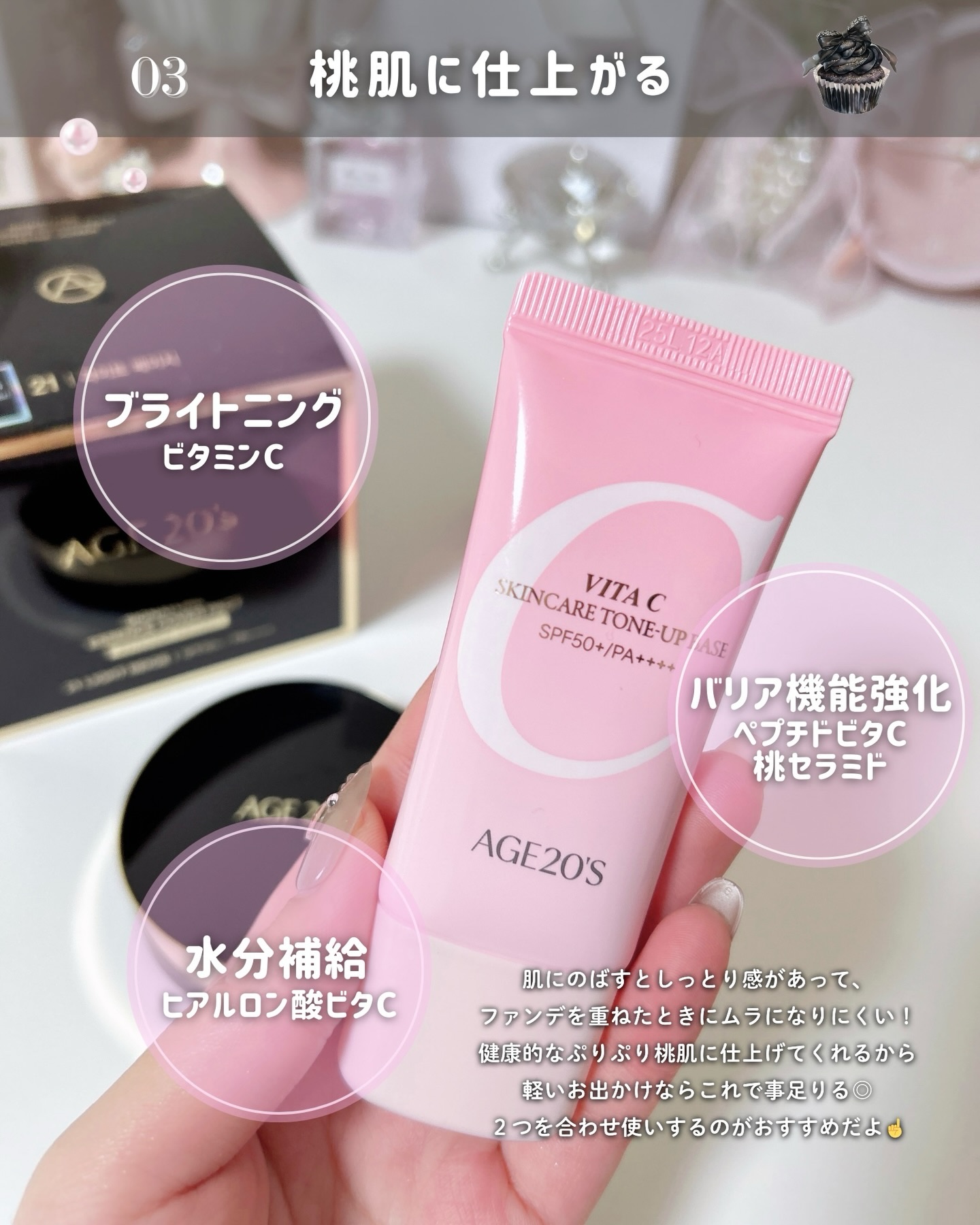 AGE20’S︎︎︎︎︎︎☑︎シグネチャーエッセンスカバーパクト21号︎︎︎︎︎︎☑︎スキンケアトーンアップ下地下地はほんのりピンクで自然にトーンアップ✨寝不足でくすみがちな朝もパッと明るい肌に見せてくれます✨パクトは美容成分がなんと71%も...