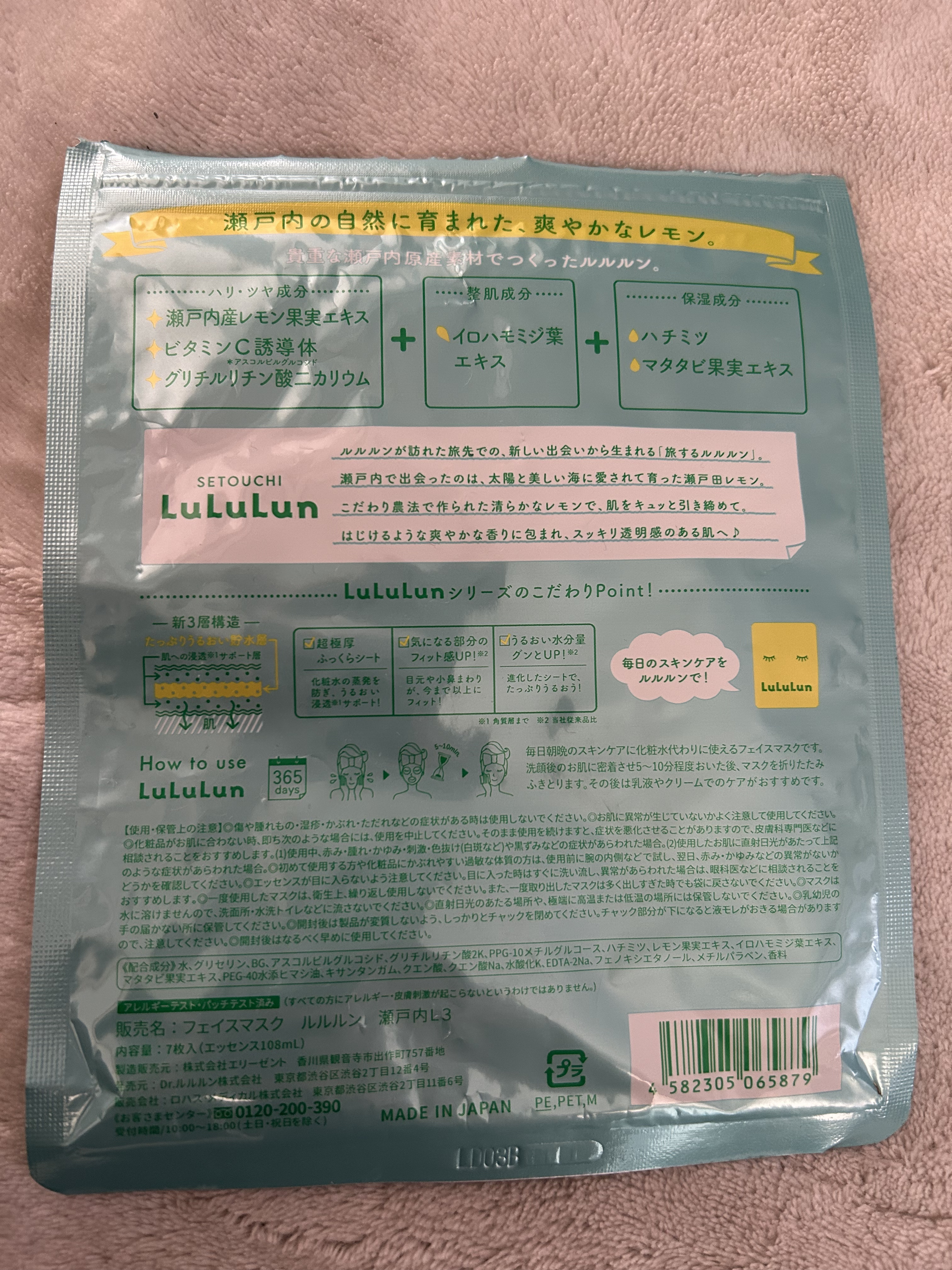 - <瀬戸内ルルルン(レモンの香り)> 水、グリセリン、BG、レモン果汁、ブドウ葉エキス、アスコルビルグルコシド、酢酸トコフェロール、セラミドNP、セラミドNG、セラミドAP、水添レシチン、フィトステロールズ、PEG-40水添ヒマシ油、キサンタンガム、クエン酸、クエン酸Na、フェノキシエタノール、メチルパラベン、香料 <瀬戸内ルルルン(レモンの香り)【旧】> 水、グリセリン、BG、レモン果汁、ブドウ葉エキス、アスコルビルグルコシド、酢酸トコフェロール、セラミドNP、セラミドNG、セラミドAP、水添レシチン、フィトステロールズ、PEG-40水添ヒマシ油、キサンタンガム、クエン酸、クエン酸Na、フェノキシエタノール、メチルパラベン、香料