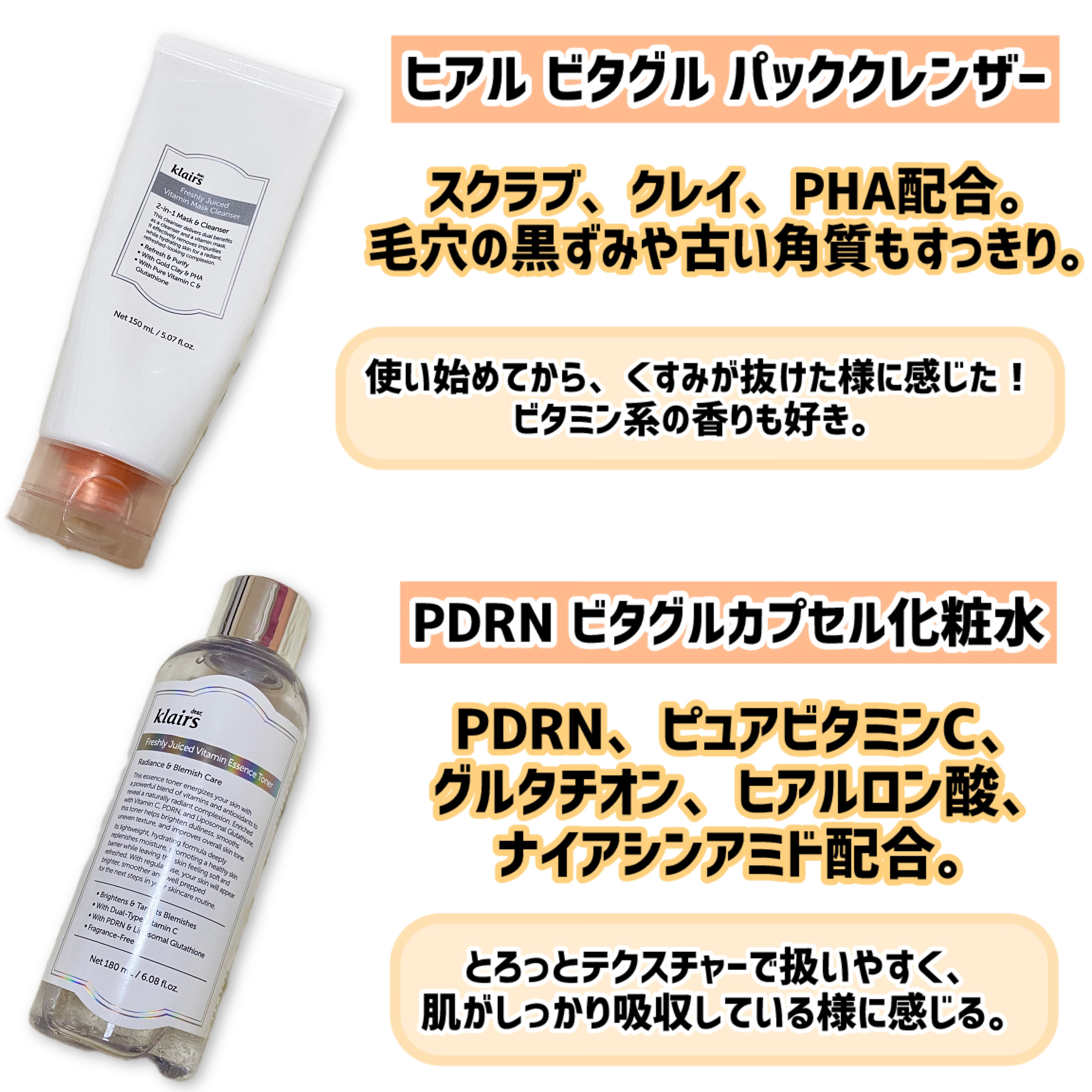 ♡klairsビタグルシリーズ♡ライン使いがおすすめなのでひとつひとつ紹介していくね🪄▫️ヒアルビタグルパッククレンザーPDRN/ビタミンC/グルタチオンが含まれていて、ブラックヘッド・ホワイトヘッドやくすんだ肌の方にぴったり。洗顔とパッ...