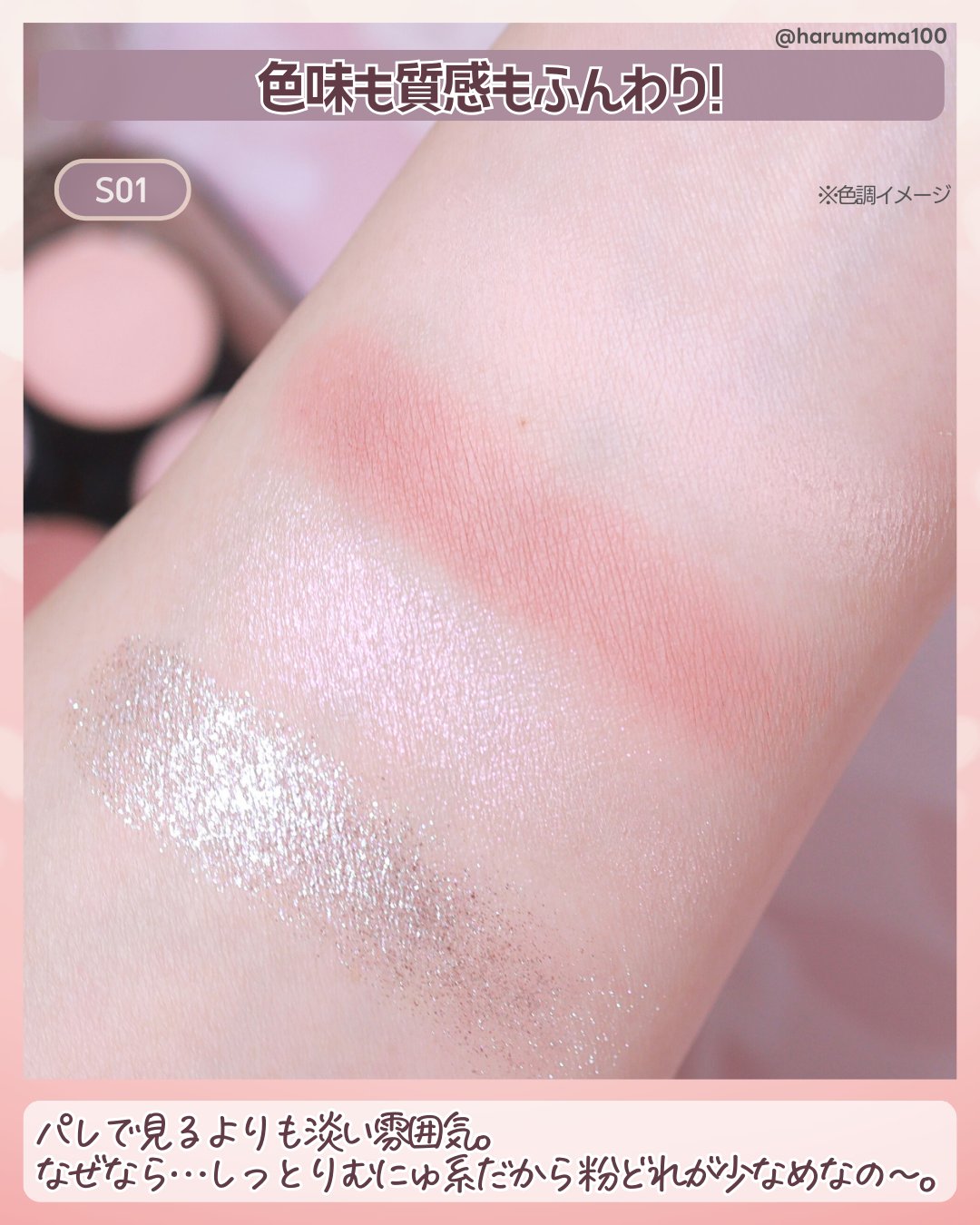 新色の「23 キューピッドピンク」は白みピンクの儚げな血色感で、透けるような奥行きとふんわり温かい雰囲気がかわいい〜♪ ミルキーカラーのリップとも相性が良いから出番が増えそう💕 テクスチャーはしっとりしていてグラデにしやすいし、なじませるとサラサラに変化するから、ベタつかずに使えた!