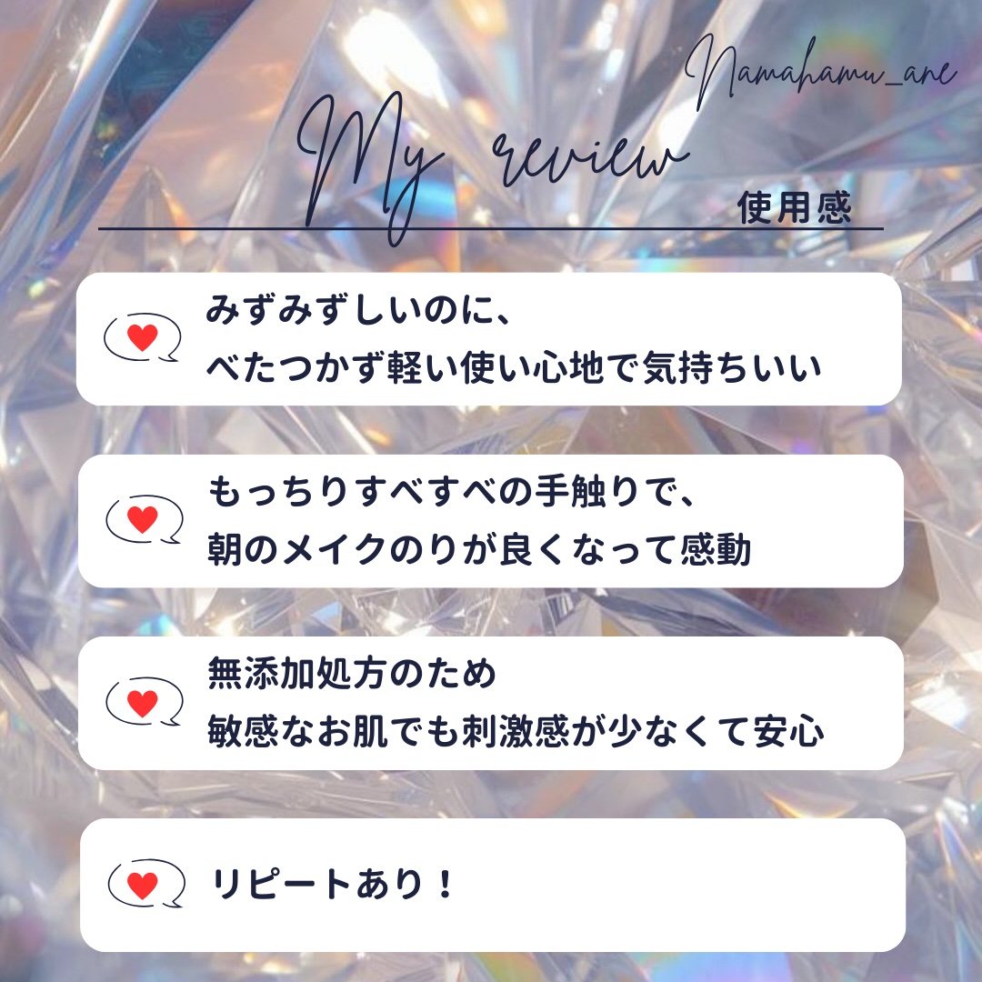 | みずみずしいテクスチャーのジェルで 乳液というより美容液に近い感じです。 軽い塗り心地で ベタつかないさっぱり系✨ | 詳細を見る |
