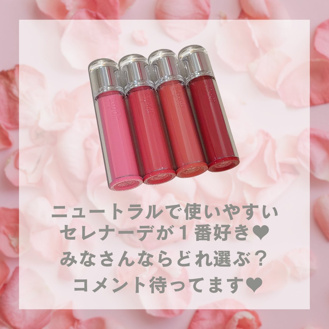 その名も.... 【 espoir クチュールリップティントグレイズ】です!!! ツヤ感が魅力的でカラー展開も豊富🦋 01. アップルシャーベット 04. ハッシュドチェリー 11 .アンダーモーブ 04番は、ウィンター様がアンバサダーとして愛用しているカラーになります♡
