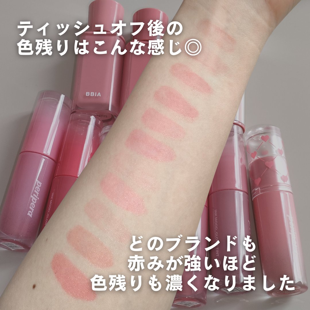 periperaインクムードグロイティント手持ち全色塗ってみました💄✨画像でまとめているので気になる方はスワイプして見てみてください☺️どの色が気になりますか?使ってる方いたら、ぜひ感想も教えてほしいです💭今後も、実際によく使ってるリップや色...