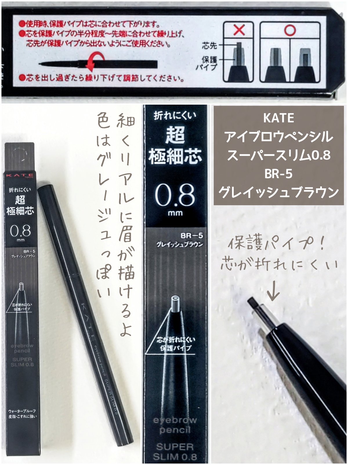 【KATE】アイブロウペンシルスーパースリム0.8mmBRー5グレイッシュブラウン超極細アイブロウペンシル!ペンシルの先に保護パイプが付いていて、パイプも透明なので、芯を出し過ぎる事がありません一本一本が描きやすいです力を入れずに優しく描くの...
