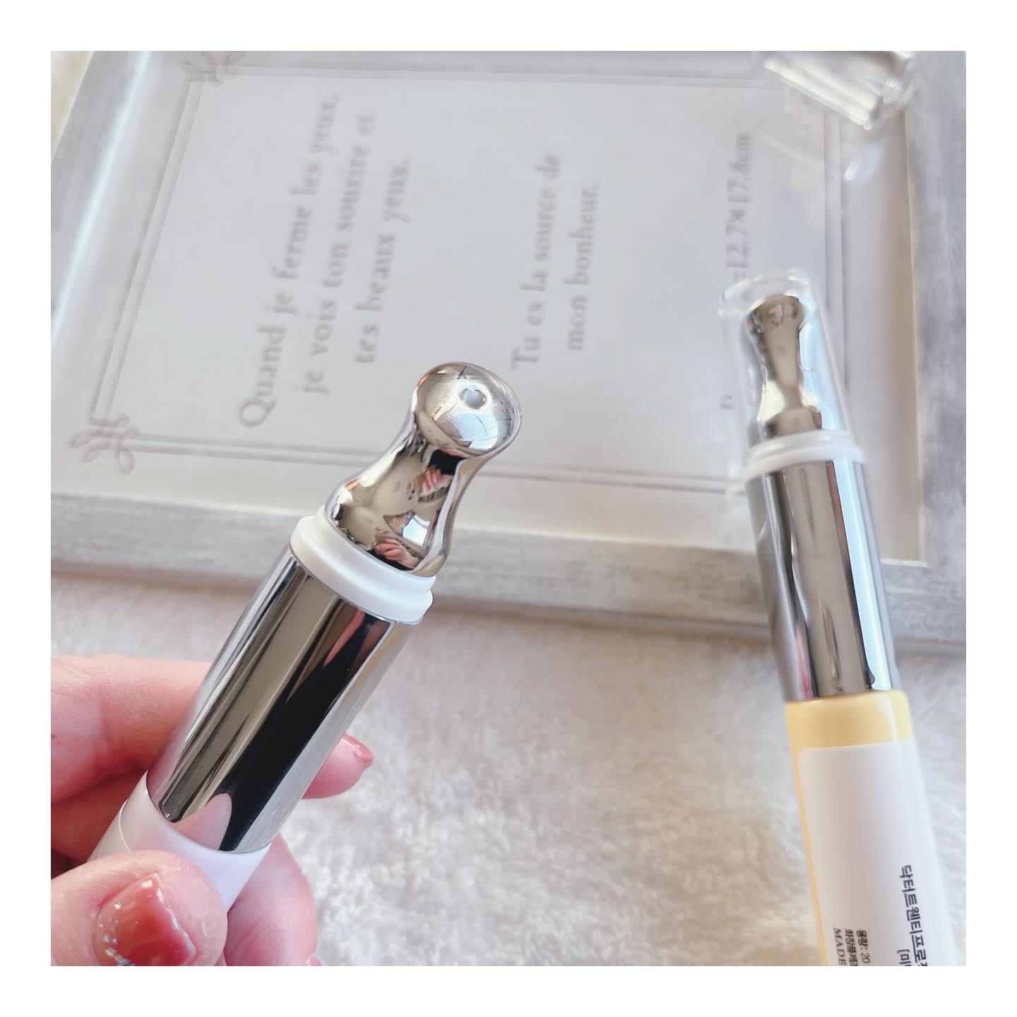 優しいオフホワイトのパッケージが見てるだけで嬉しい気持ちに。 中の化粧液は、ほんのーりトロミがあって柔らかいテクスチャー。 効果的な使い方は、1度顔全体に伸ばしたあと、さらに重ね付けすることなんだそう。