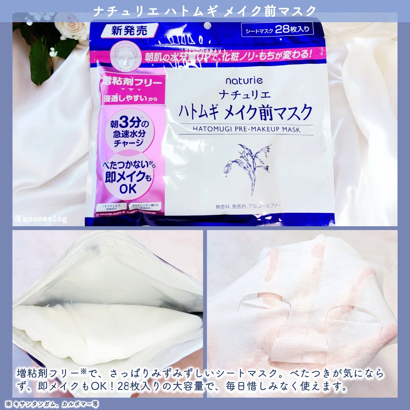 ナチュリエさまからいただきました。ハトムギ化粧水で有名なナチュリエから3分で水分チャージ!ハトムギメイク前マスクが新登場💙◎増粘剤*フリーのさっぱりみずみずしいシート◎マスク後ベタつきが残らないから即メイクOK◎朝に嬉しい美容成分配合(ハトム...