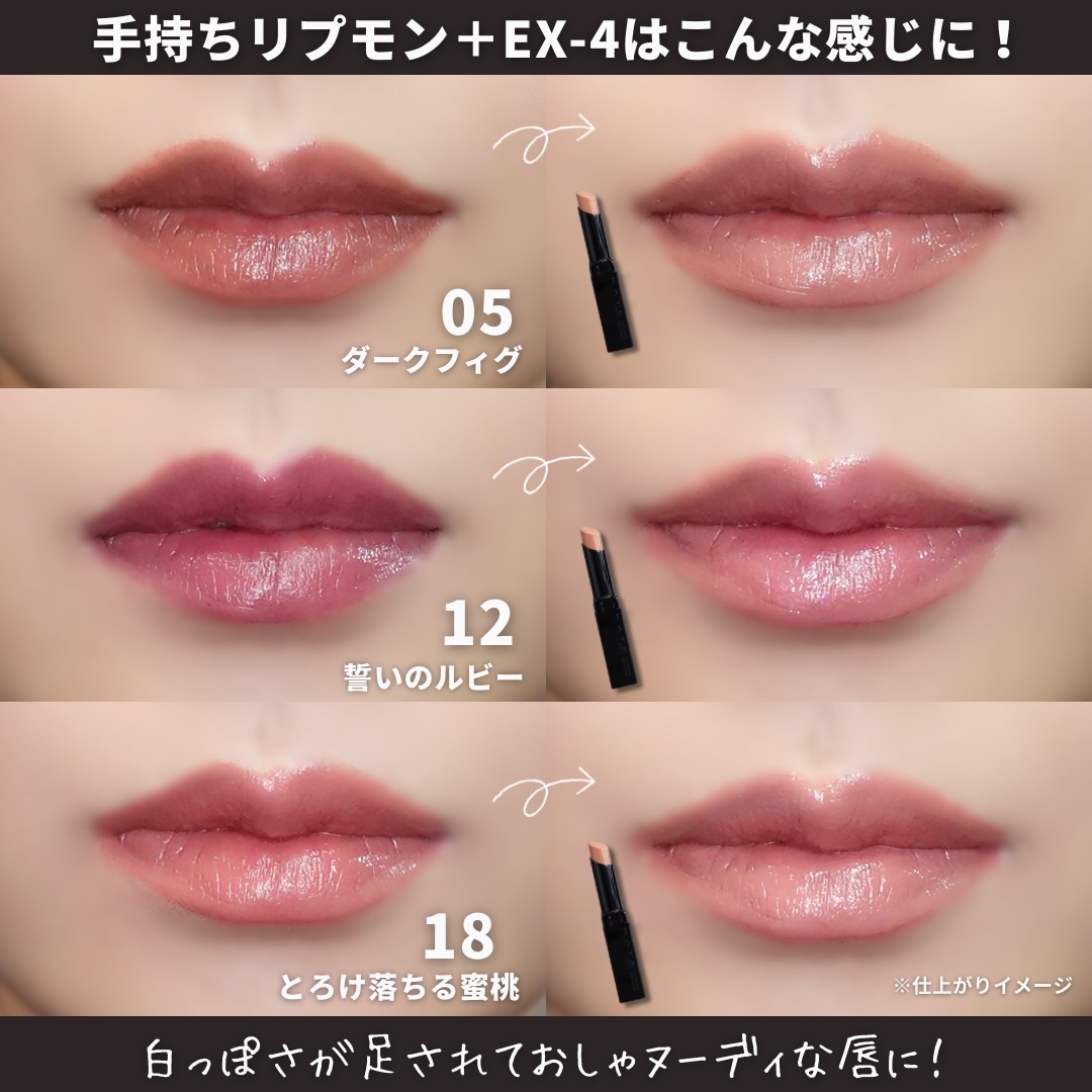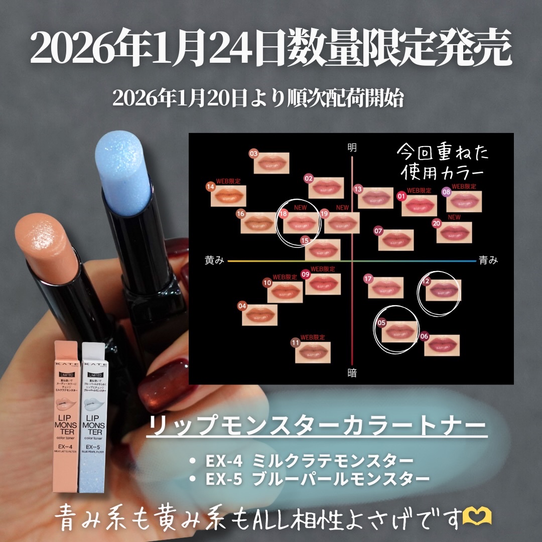 - 【数量限定発売】 口紅の上から重ねて色変化 長時間色持続する闇色モンスター。 当社独自の色持ち技術で、重ねるとモンスター化して落ちにくいリップへ! ■EX-1 苔色モンスター ライトグリーンのリップ上地で、ミルキーなくすみカラーへチェンジ。 ■EX-2 鉄色モンスター ライトグレーのリップ上地で、ダークなスモーキーカラーへチェンジ。 ■EX-3 闇色モンスター クリアブラックのリップ上地で、ダークな深みカラーへチェンジ。 ■EX-4 ミルクラテモンスター 口紅の上から重ねてまろみのある白っぽヌーディーカラーへ色変化 ■EX-5 ブルーパールモンスター 口紅の上から重ねてブルーパールがきらめくパール入りリップへ変化