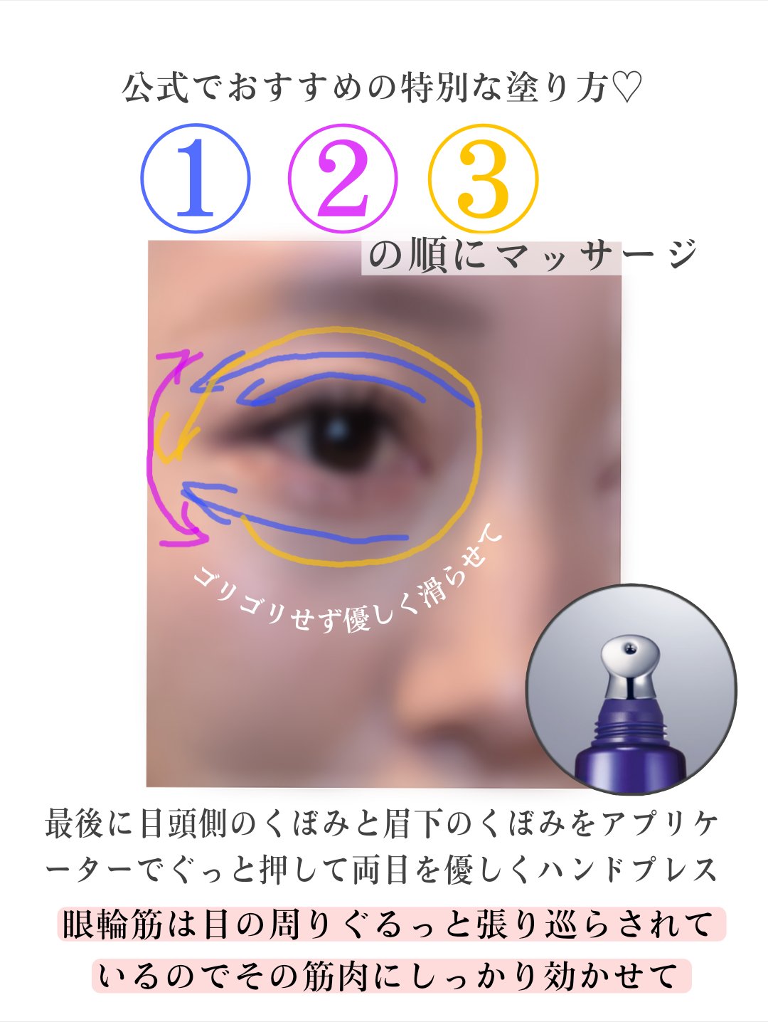 | 目尻、目袋、まぶたへの全方位に塗ることが出来て、目まわりに多角的にアプローチして、ハリを与えます。 | 詳細を見る | ||