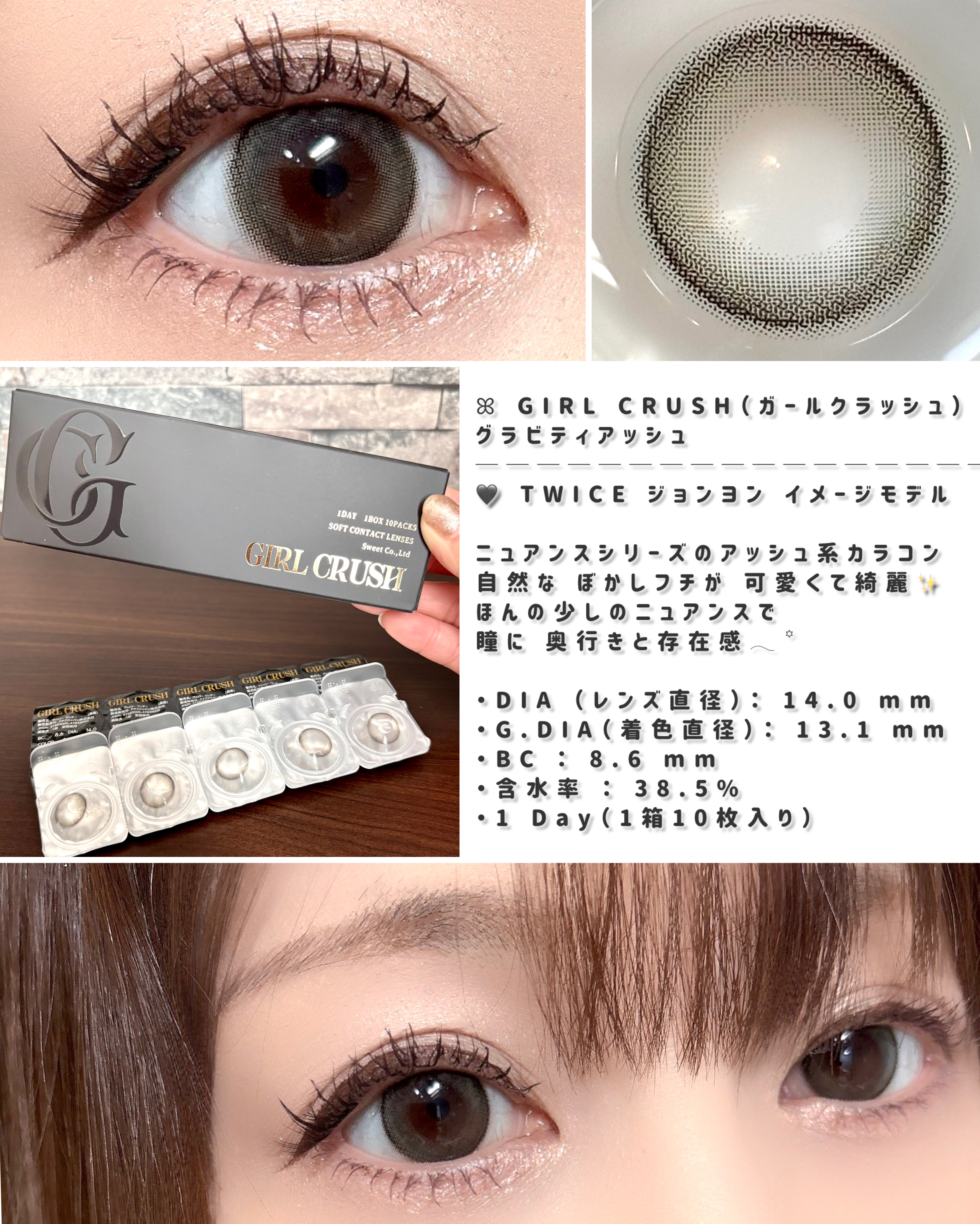 【Sweet】TWICEイメモカラコン👀提供:Sweet様紹介カラコン⊹Sweetメビラージュ1day-TwilightLily¥1,760DIA14.0mmBC8.6mm着色直径13.1mm含水率38.5%1day10枚入りラディリス1...