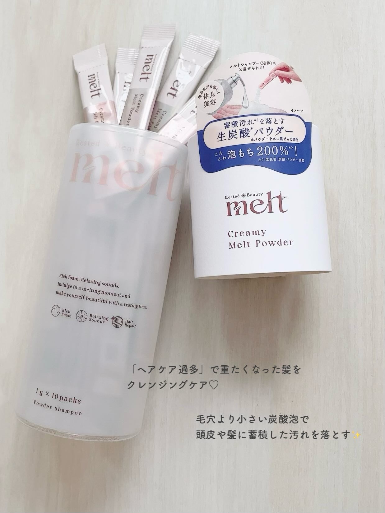 \改良新発売の”生炭酸”パウダーでスッキリ/📝meltメルトモイストシャンプー/トリートメント480ml¥1,760〜クリーミーメルトパウダー1g×10包¥242〜特徴⇩・毛穴より小さい炭酸泡・頭皮ケア+ブースター効果・摩擦ストレスを軽減・メ...