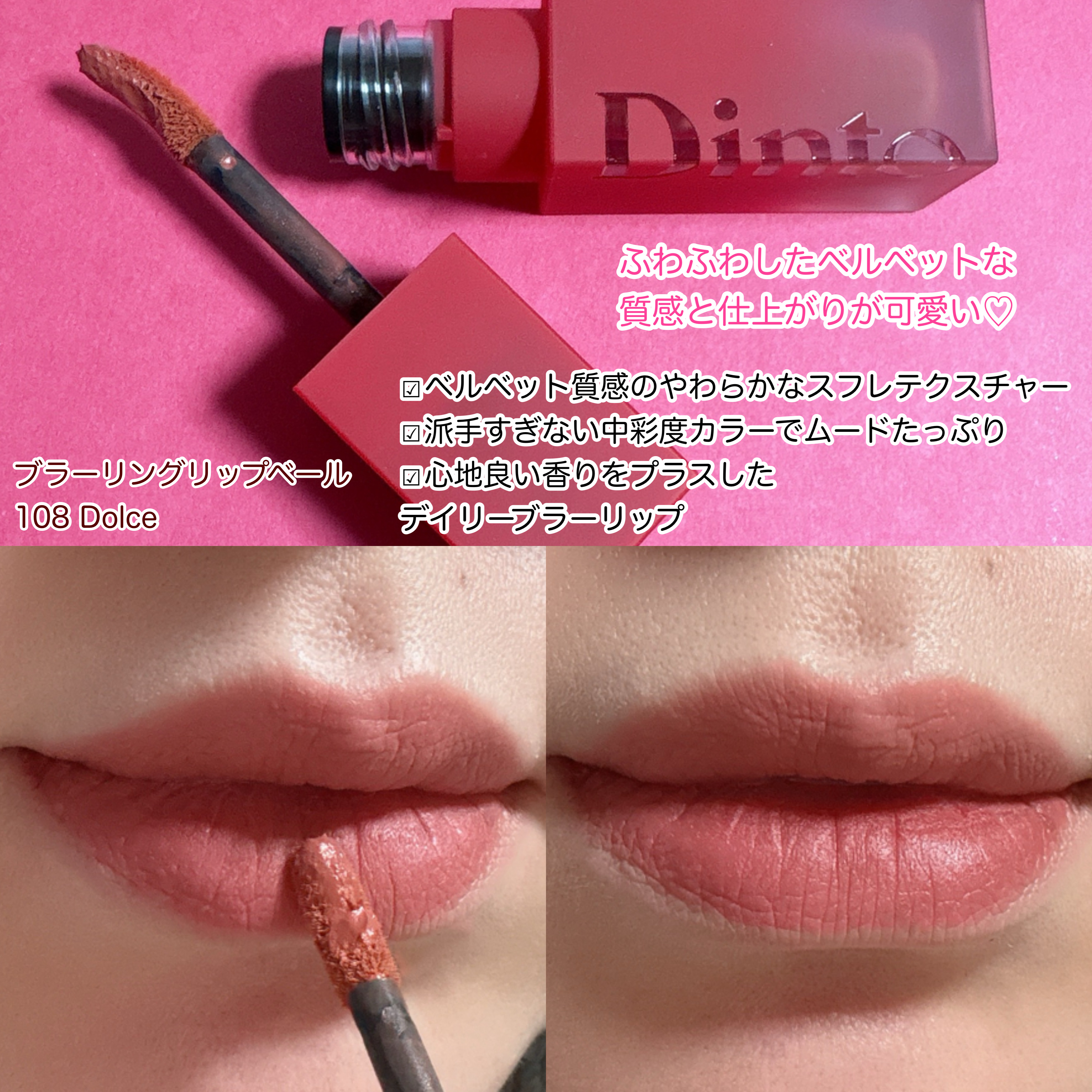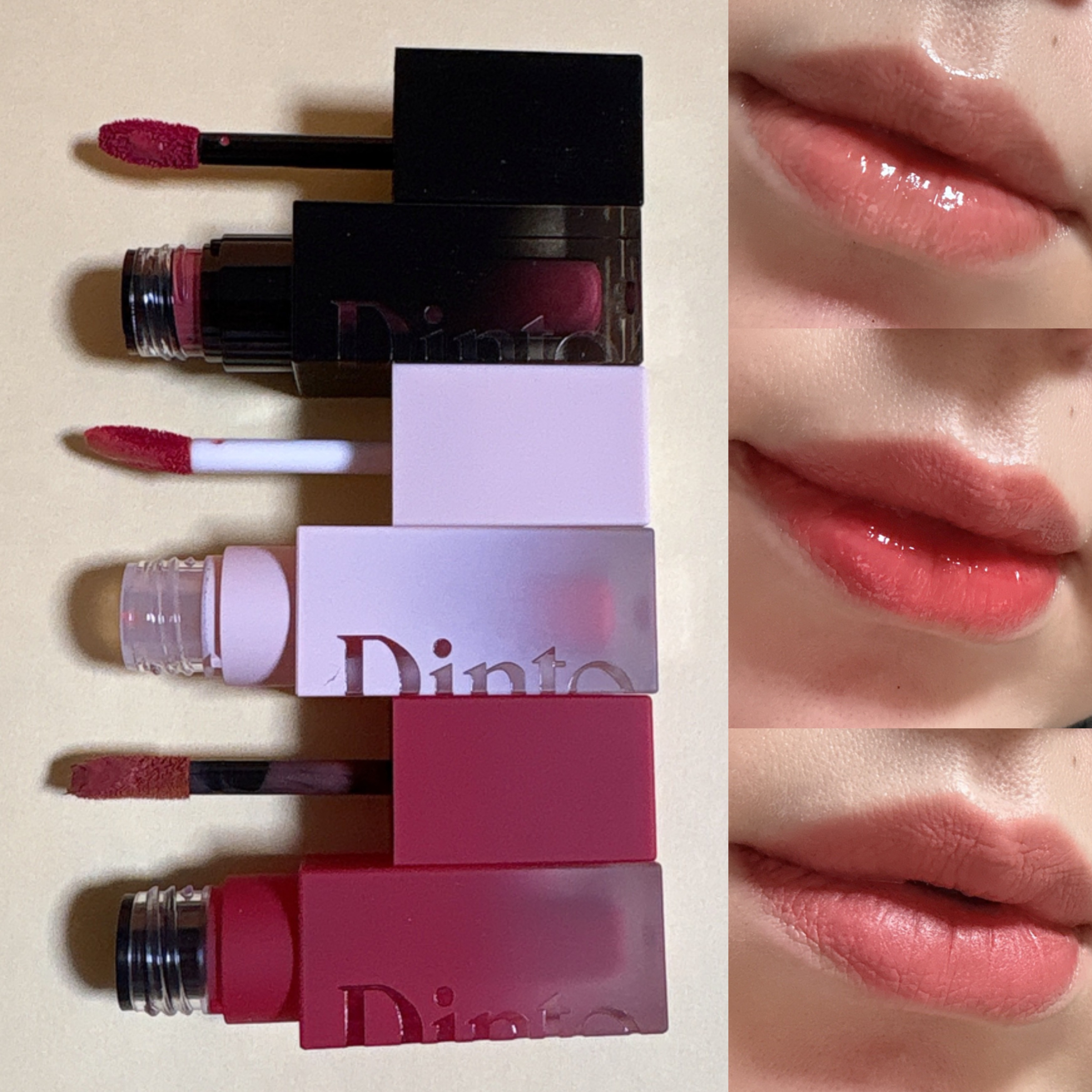 Dintoのイエベ向けの質感の違うリップ「ジェリー」「ベルベット」「ブラー」を画像にて比較💄✨・773PeachGelée(ツヤ)・108Dolce(マット)・206Gratia(ブラー)いずれも香りや発色、密着、持続抜群でとても使いやすかっ...