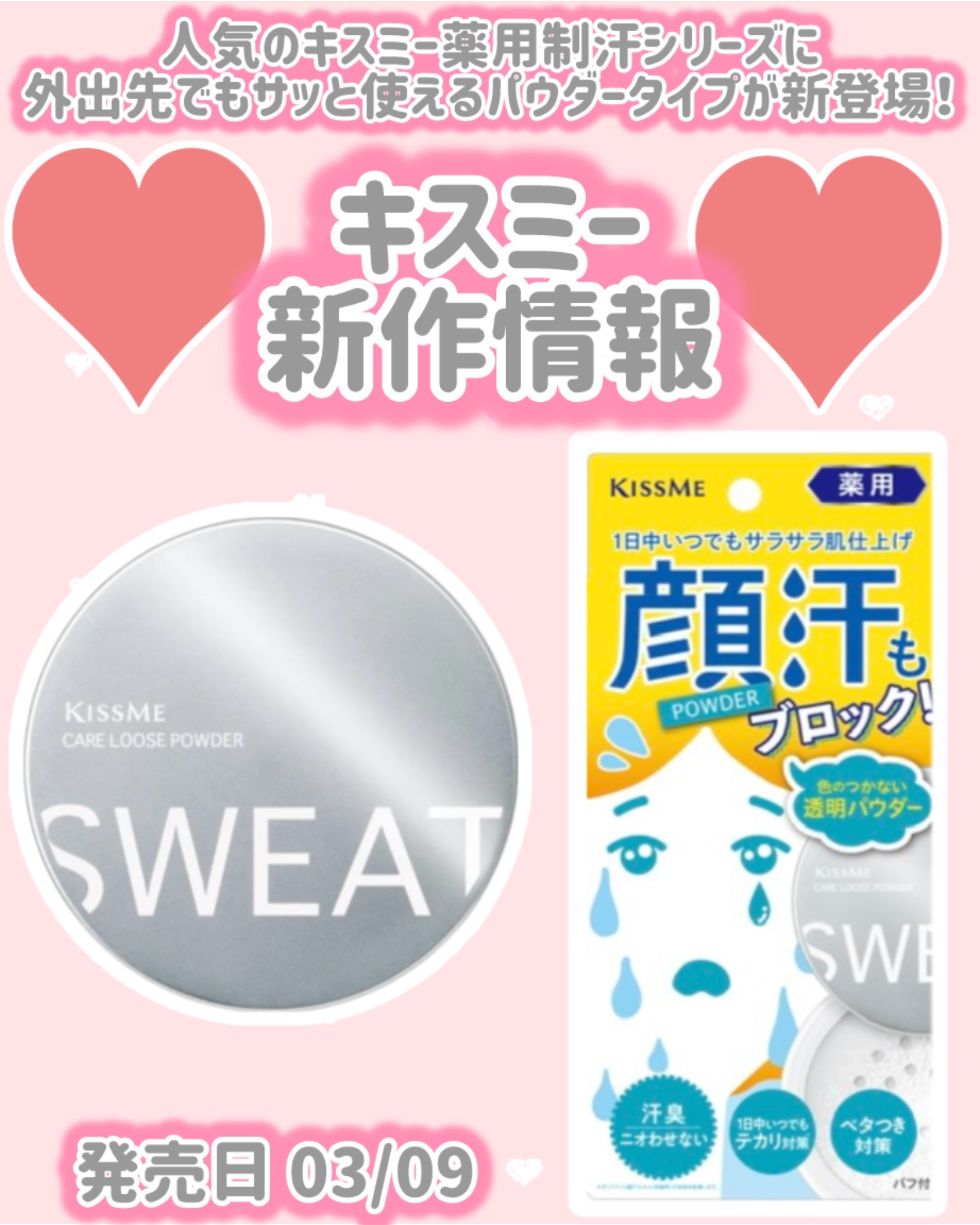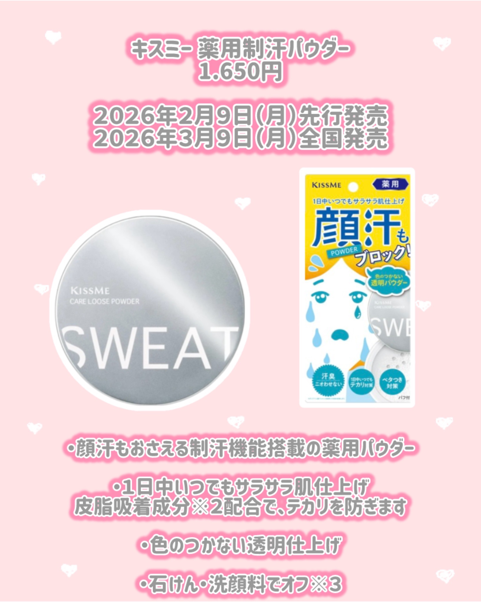 - 【医薬部外品】 ●顔汗もおさえる制汗機能搭載の薬用パウダー 毛穴を引き締めながら、汗の出口をブロックする2つの作用を持つ有効成分ミョウバン※1を配合。 気になるベタベタ汗を抑え、気になる汗臭も防ぎます。 ※1 硫酸アルミニウムカリウム ●1日中いつでもサラサラ肌仕上げ 皮脂吸着成分※2配合で、テカリを防ぎます。 ※2 ポリアクリル酸アルキル(吸着剤) ●色のつかない透明仕上げ 透明パウダーでメイクの上からでもお使いいただけます。 ●石けん・洗顔料でオフ※3 ※3 単品使用時 ●持ち運びに便利なコンパクトサイズ 持ち運びやすいサイズで、パフが付いたコンパクト。 外出先でのお直しにも活躍します。 2026年2月9日(月)先行発売 2026年3月9日(月)全国発売