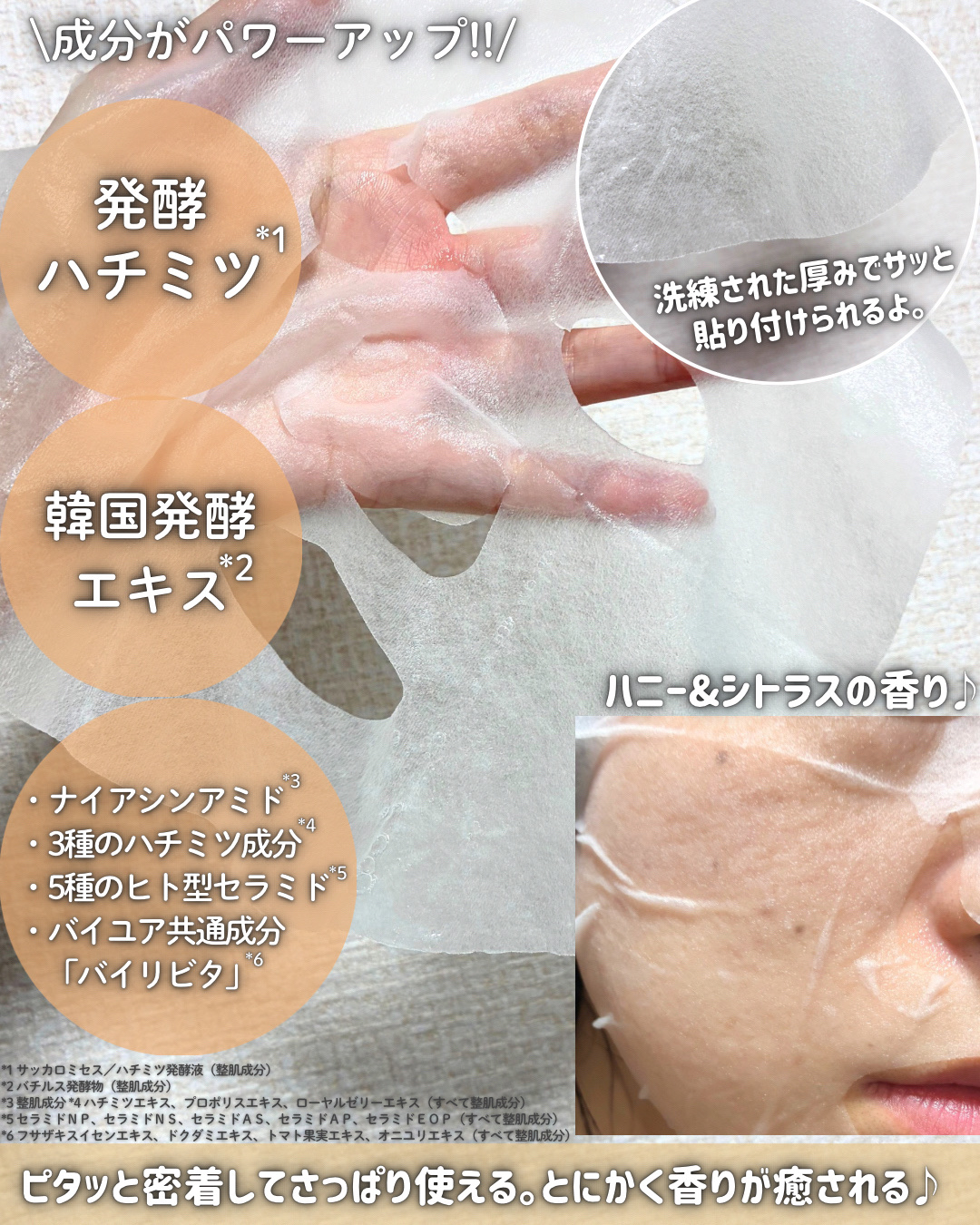 - <30枚> 水、BG、グリセリン、ヒアルロン酸Na、加水分解ヒアルロン酸、カルボマー、香料、ローヤルゼリーエキス、グリチルリチン酸2K、エチルヘキシルグリセリン、ツボクサエキス、水添レシチン、セルロースガム、クエン酸、アセチルヒアルロン酸Na、セラミドNP、ポリアクリル酸Na、コレステロール、パルミトイルテトラペプチド-7、パルミトイルトリペプチド-1、3-O-エチルアスコルビン酸、パンテノール、1,2-ヘキサンジオール、アラントイン、EDTA-2Na、トリ(カプリル酸/カプリン酸)グリセリル、ヘキサペプチド-9、アセチルヘキサペプチド-8、ナイアシンアミド、パルミトイルペンタペプチド-4、トロメタミン、アデノシン、カプリル酸ポリグリセリル-6、ヒドロキシアセトフェノン、ハチミツエキス、プロポリスエキス、カミメボウキ葉エキス、メリアアザジラクタ葉エキス、メリアアザジラクタ花エキス、ウコン根エキス、サンゴモエキス、カプリン酸ポリグリセリル-4、ノナペプチド-1