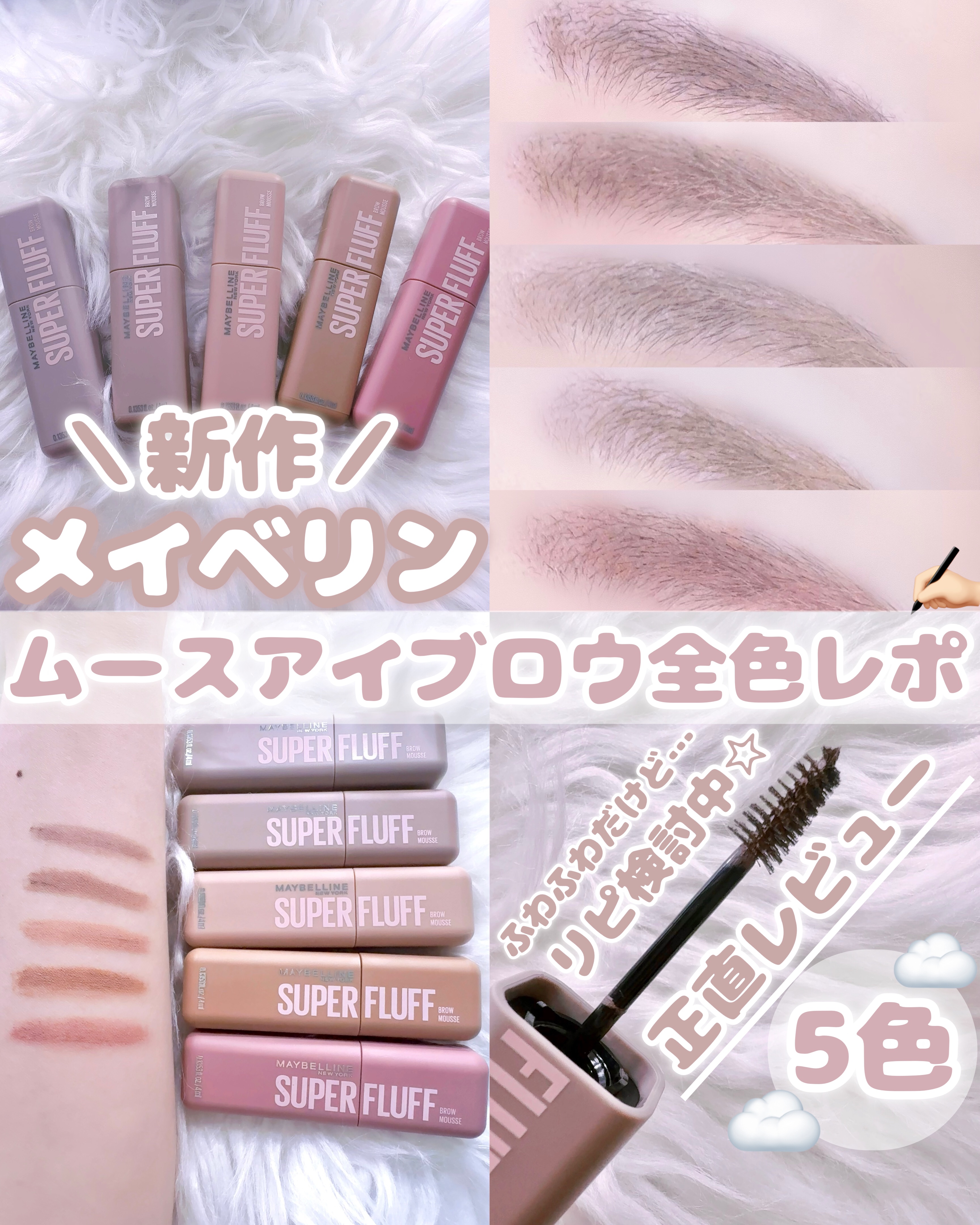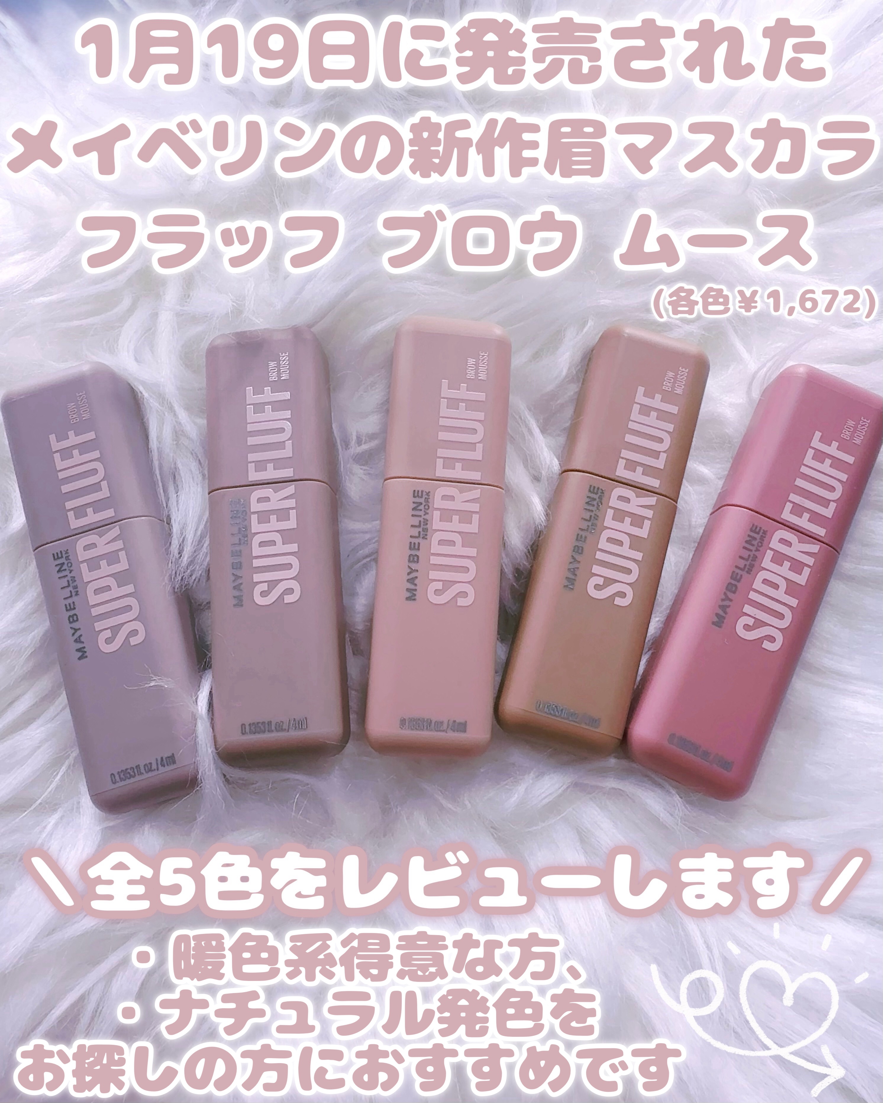 - \NO MORE パリパリ眉!/ 1日*ずっと、ほわっふわ眉。ムラなく色づき、黒眉ミュート ★商品特徴 ①エアリームーステクスチャー 空気とパウダーを混ぜて泡立てたような、軽やかなホイップムーステクスチャーだから、 べったりつかず、固くならない。ふわふわ仕上がり24時間*つづく。 ②テク要らずミニブラシ 先端に向かって細くなるブラシが、細かい毛も余さずキャッチするから、眉頭から眉尻まで均一にムラなく塗れる。 ③全5色展開 なりたい印象に合わせて選べる5色展開。 自眉の黒を消して存在感を抑えたい方にも、髪色に合わせた自然な眉にしたい方にも。 ★カラー展開 -ピンクアッシュ :いちごムースラテ -ライトブラウン :キャラメルムースラテ -ヌードベージュ :バニラムースラテ -アッシュブラウン:ミルクチョコムースラテ -グレーブラウン :ごまムースラテ * メイベリンニューヨーク調べ。個人差があります。