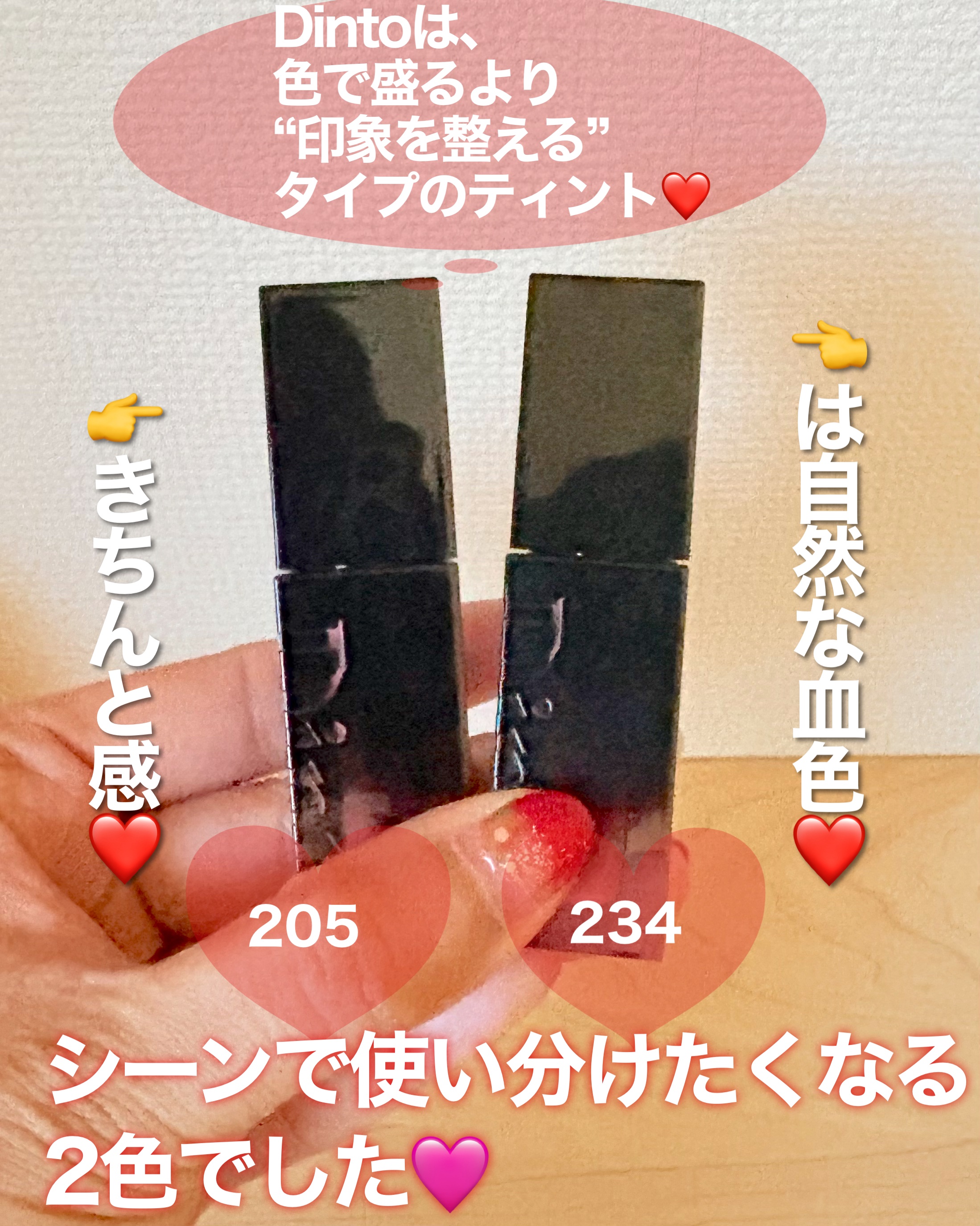 Dintoさまからいただきました💎落ちないリップ‼️で知られるDintoの代表的なイメージのあるティント。205は韓国一番人気の可愛いピンク、218は日本で一番人気のカラーの深みのある血色カラー。ピタッと馴染む。唇の内側に塗ってぼかして、足し...